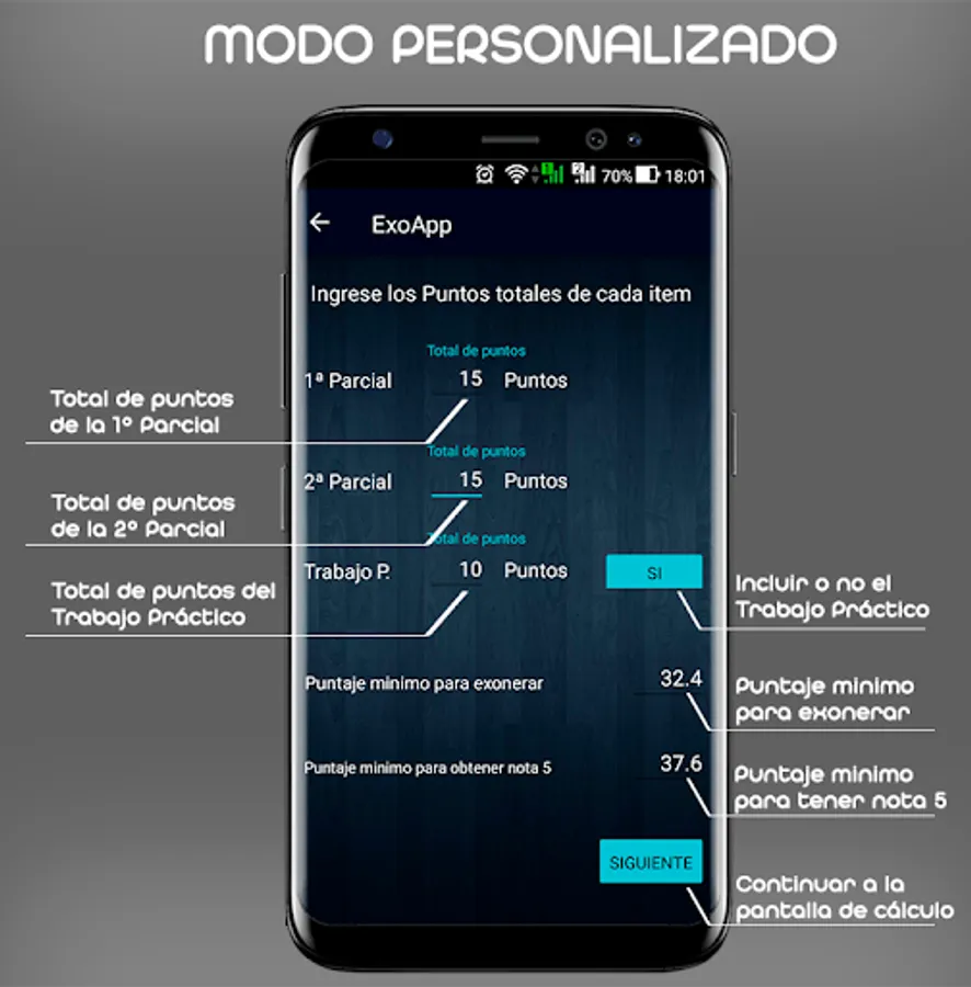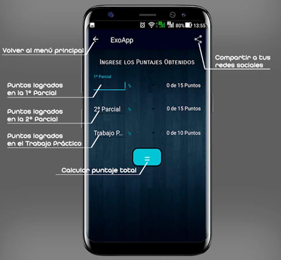 ExoApp is an application that helps students to calculate if they reach the minimum score that is required to exonerate the subject, in case you do not exonerate, it allows you to know how many points you lacked to exonerate and the points that you must do in the final to pass at least with a note 2.
