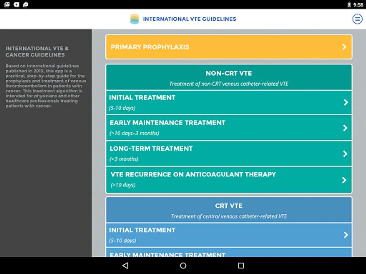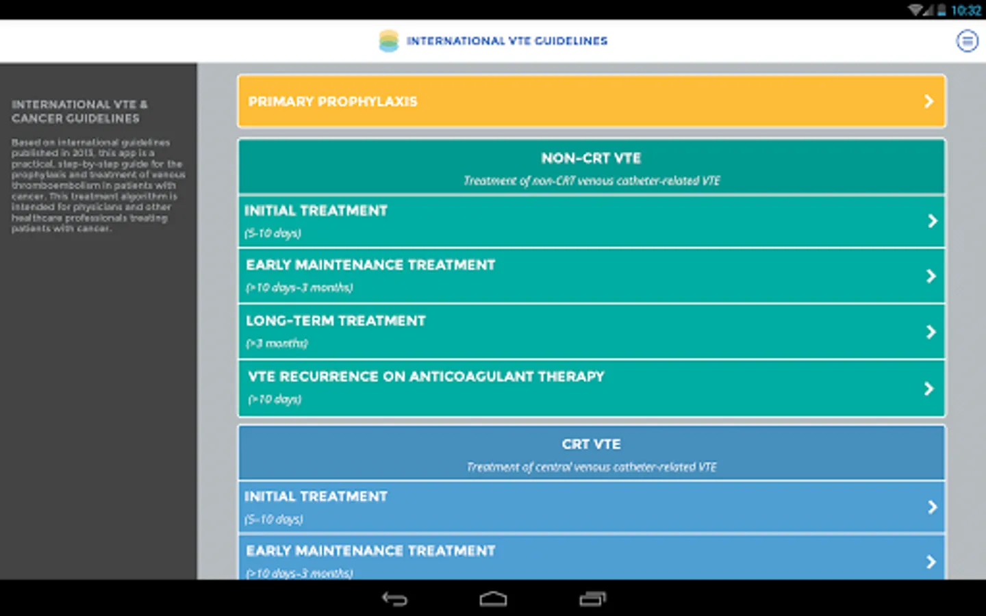 Based on international guidelines published in 2022, which were developed with methodological support from the Institut National du Cancer (INCa) in France and endorsed by the International Society on Thrombosis and Hemostasis (ISTH), this app is a practical step-by-step guide for the prophylaxis and treatment of venous thromboembolism (VTE: deep vein thrombosis (DVT), pulmonary embolism (PE), catheter-related thrombosis) in patients with cancer, including:
