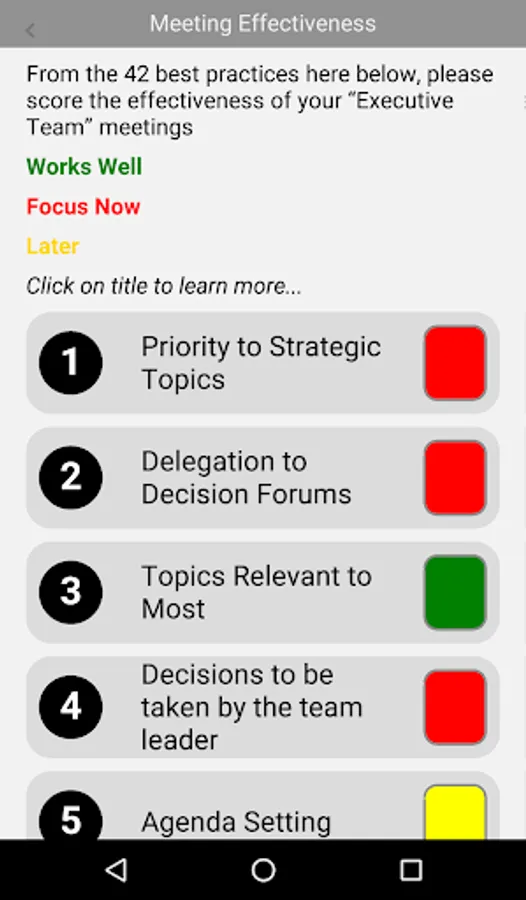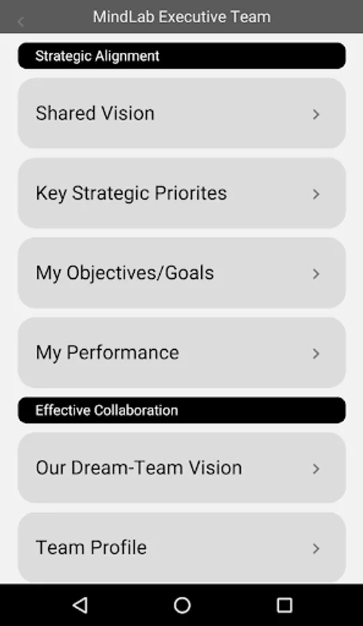 Through the DreamTeam app, your team can improve your collaboration and alignment through a number of customized modules; shared vision, strategic alignment on key strategic priorities, future desired state for team collaboration, map of similarities and differences in how the team-members work, meeting effectiveness, etc.