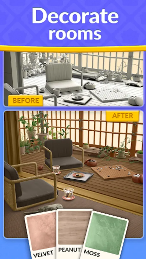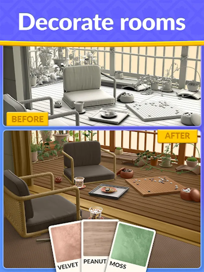 Our new-generation mahjong game will have you addicted to solving tile-matching puzzles, coloring beautiful Zen rooms, reaching new levels, and becoming the match master. There's never a dull moment when you play our unique tile-matching puzzle game!