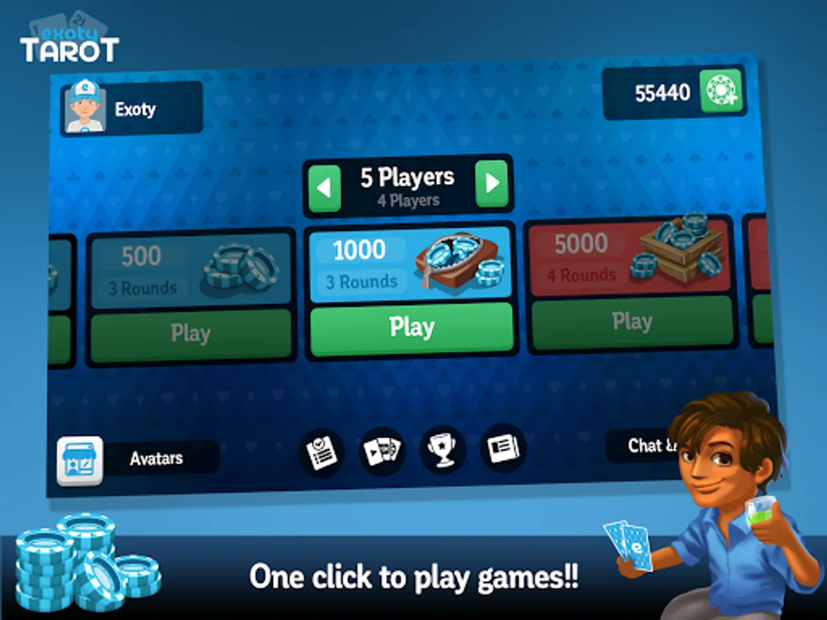 You can play tarot with 3,4 or 5 players the game respects the real rules of the F.F.T. Beginner or confirmed you will face players of your level according to the availabilities, in which case, you will face a player approximately of your level. In accordance with the French law of card games, the distribution of cards is 100% random for all games and for all players and this will NEVER change! Thank you for playing Exoty Tarot 🎉
