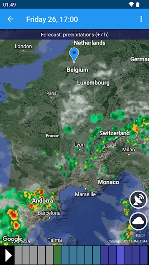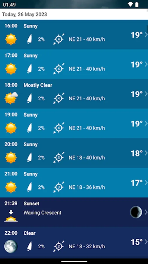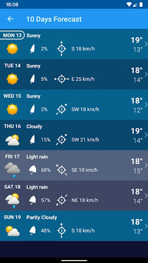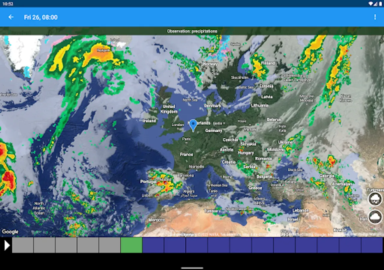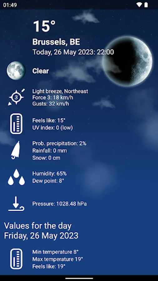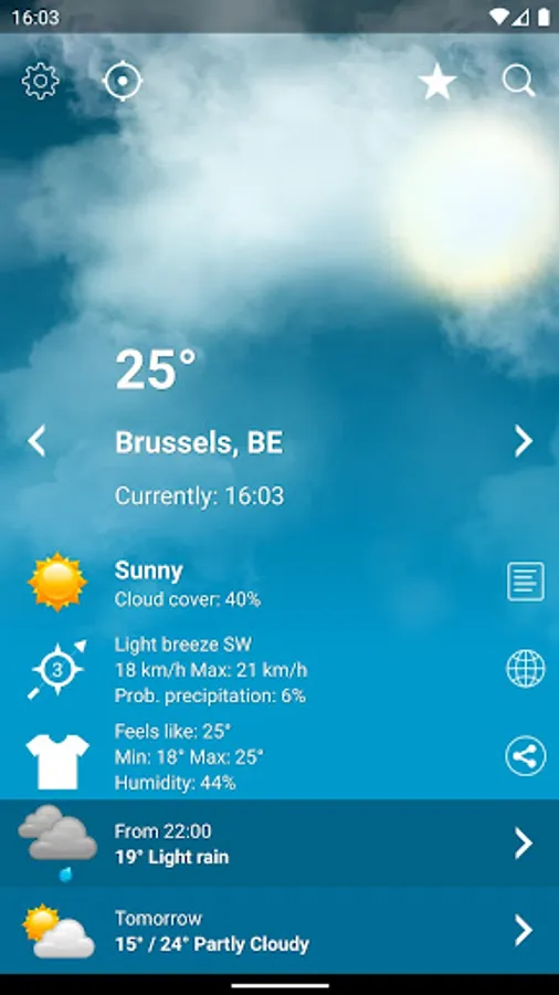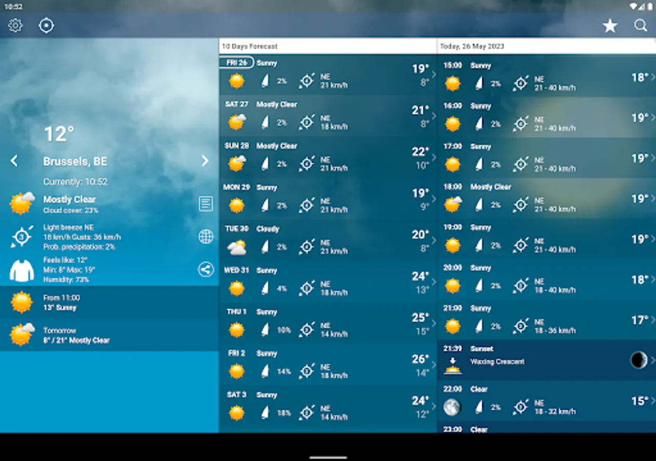 • Info available hour by hour (Temperature, Probability of rain, Wind speed, Cloud cover, Humidity, Pressure)