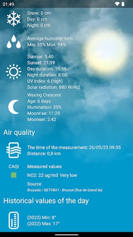 - Consult air quality information: we display data measured by official stations, for more info: https://exovoid.ch/aqi