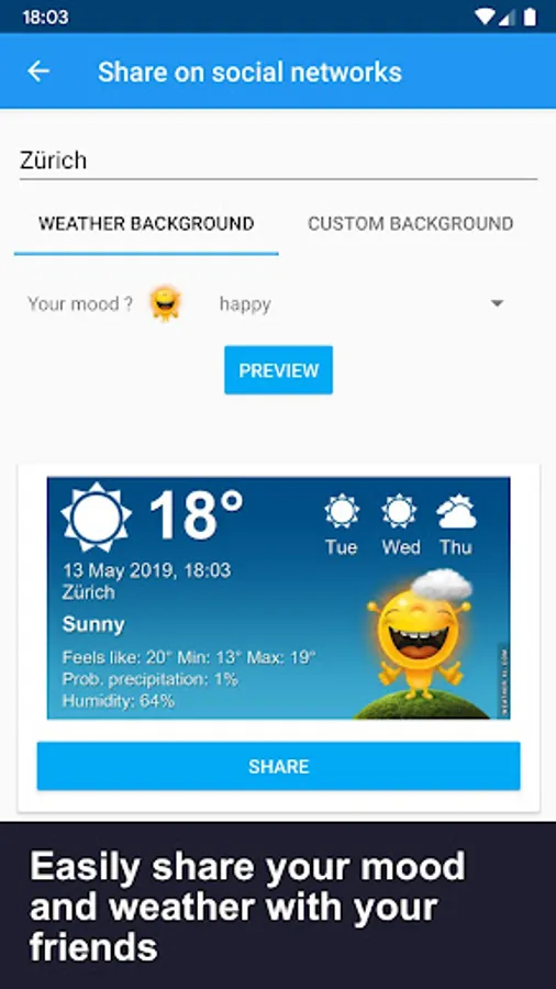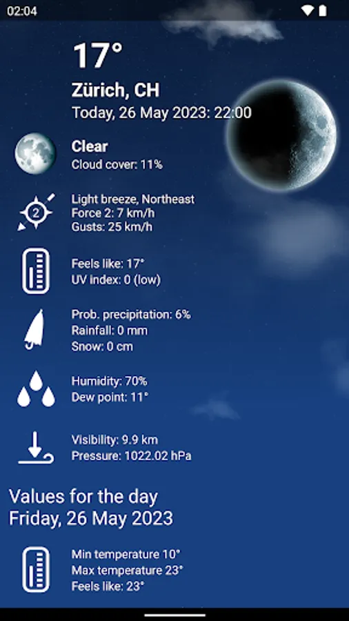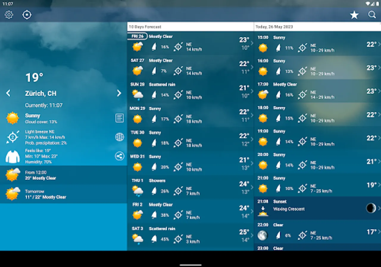 • Info available hour by hour (Temperature, Probability of rain, Wind speed, Cloud cover, Humidity, Pressure)