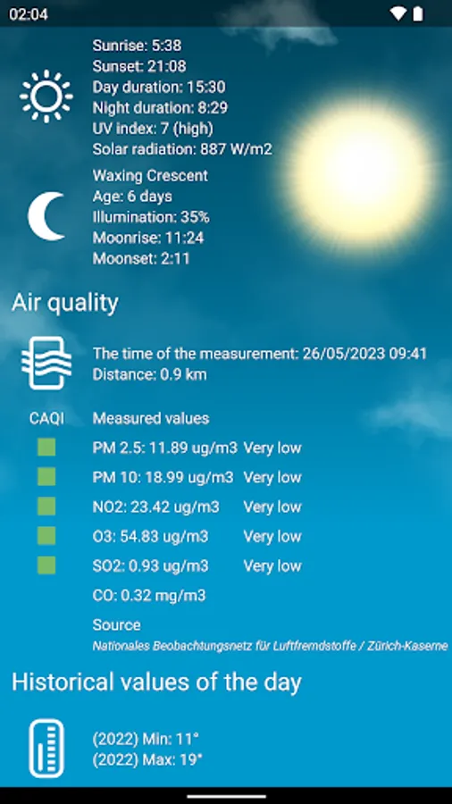 - Consult air quality information: we display data measured by official stations, for more info: https://exovoid.ch/aqi