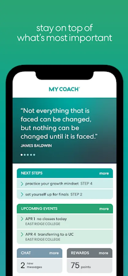 College doesn’t have to be an overwhelming stream of deadlines and to-dos. We promise! With the MyCoach® app, everything is in one place, personalized to your needs, with tips from experts and coaches along the way.