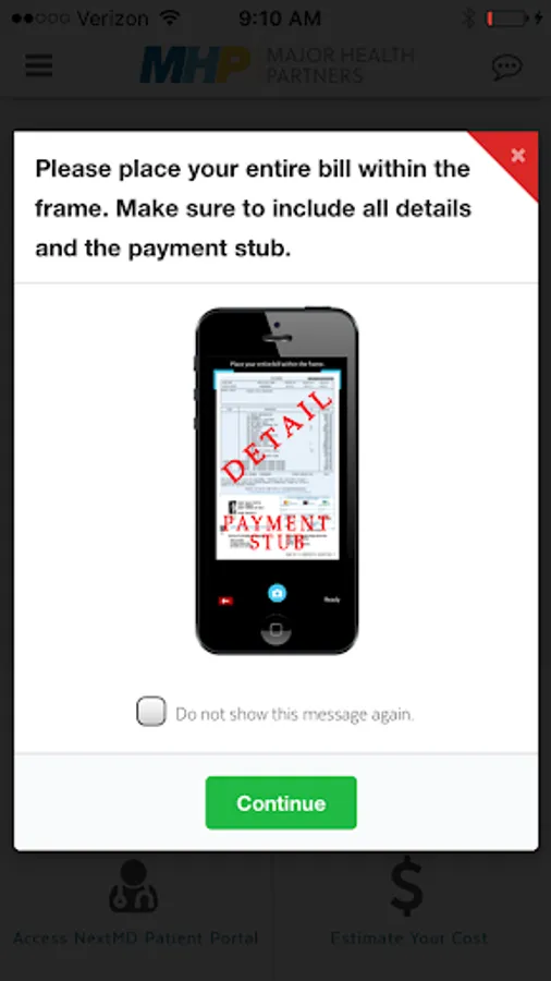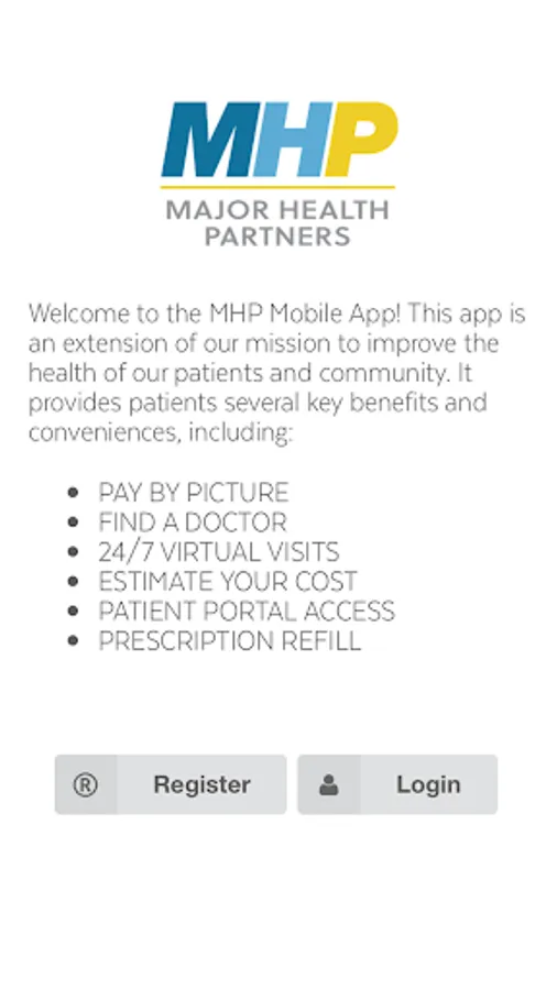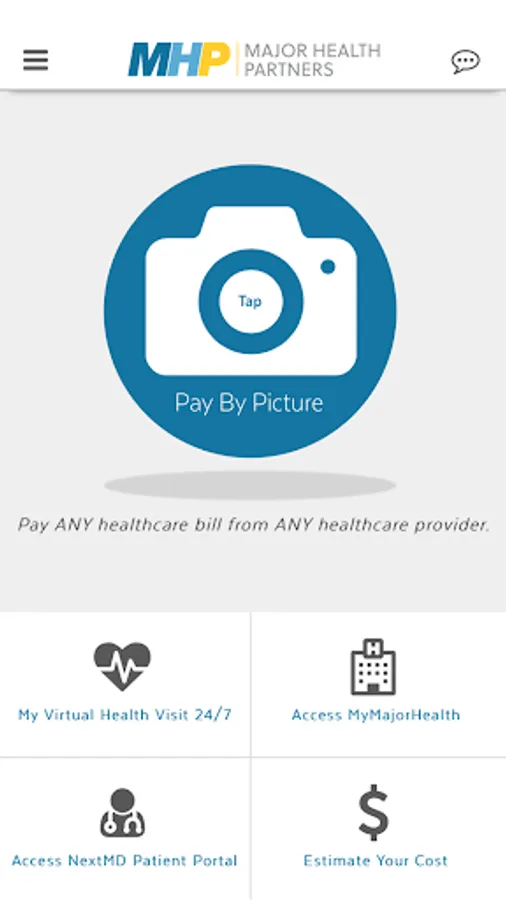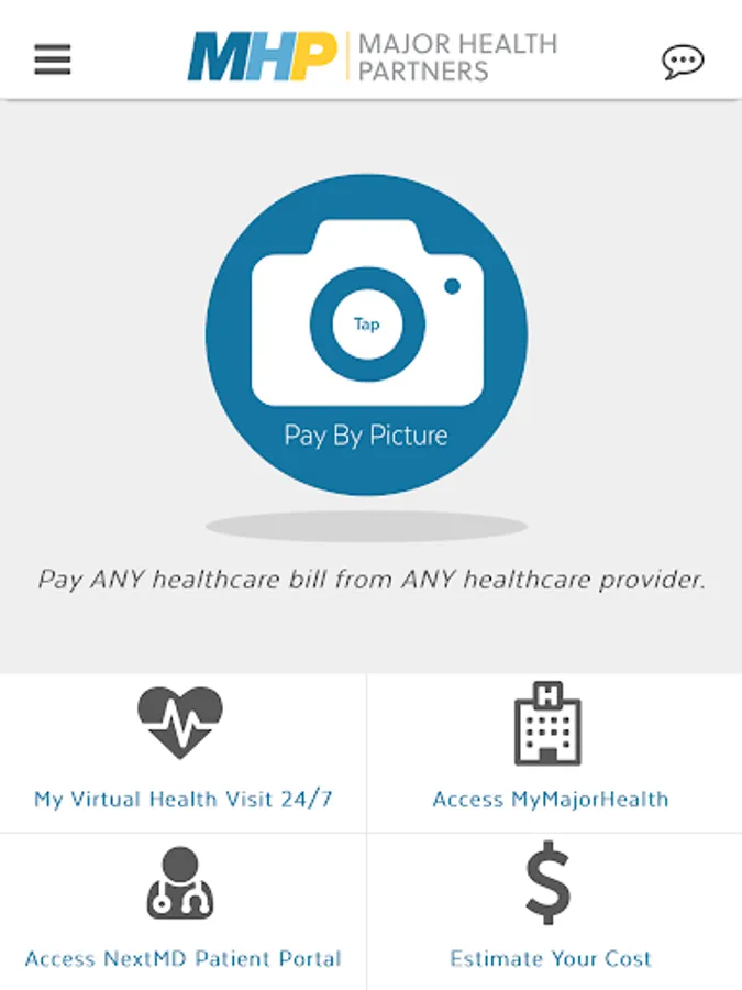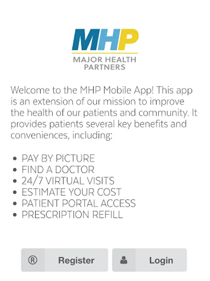 The Major Health Partners (MHP) app is an extension of our mission to improve the health of our patients and community. It provides patients several key benefits and conveniences, including: PAY BY PICTURE, FIND A DOCTOR, 24/7 VIRTUAL VISITS, ESTIMATE YOUR COST, PATIENT PORTAL ACCESS, and PRESCRIPTION REFILL.