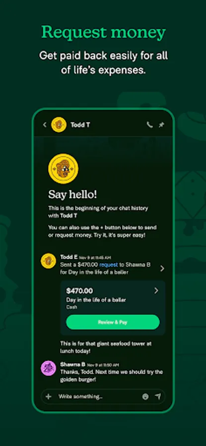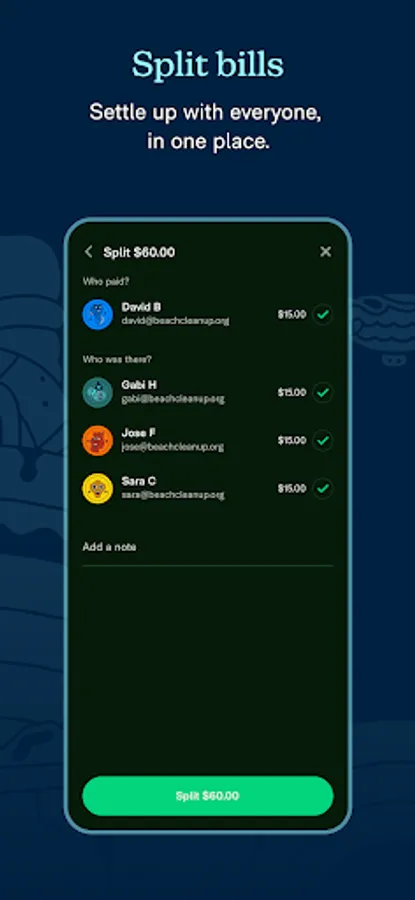 Split Bills: Split payments between friends, so the person who settled the tab gets paid back. Perfect for that dinner out with friends, a shared electric bill, or the cost of a gift for a friend’s wedding. Splitting expenses has never been easier!