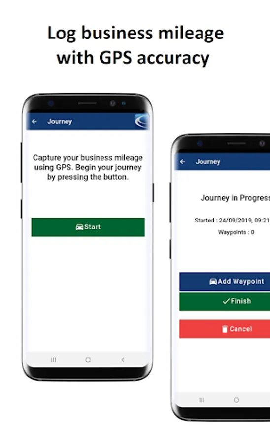 • Tapping ‘Start’ and ‘Finish’ allows GPS to quickly pre-populate mileage logs