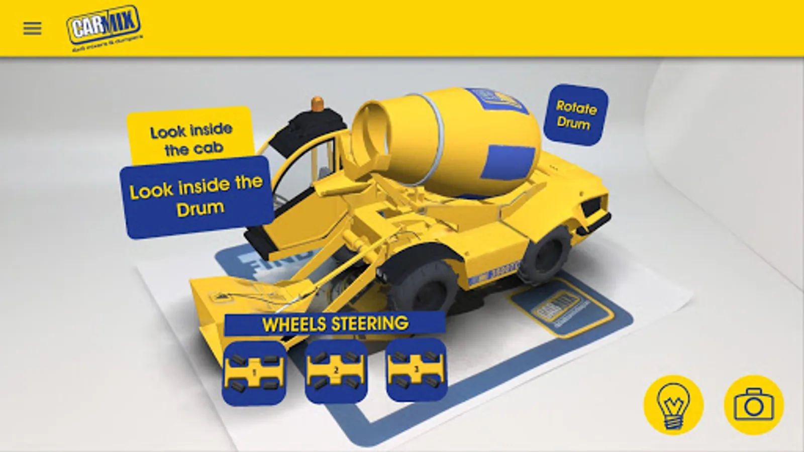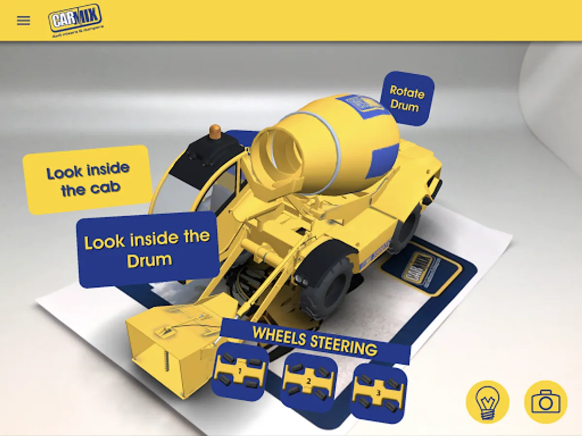 With CARMIX PLUS you will experience the new augmented reality platform with video and 3D models pointing out the strongest advantages and main key points of Carmix philosophy such as, loading, mixing, quality control, weighing scale, etc.