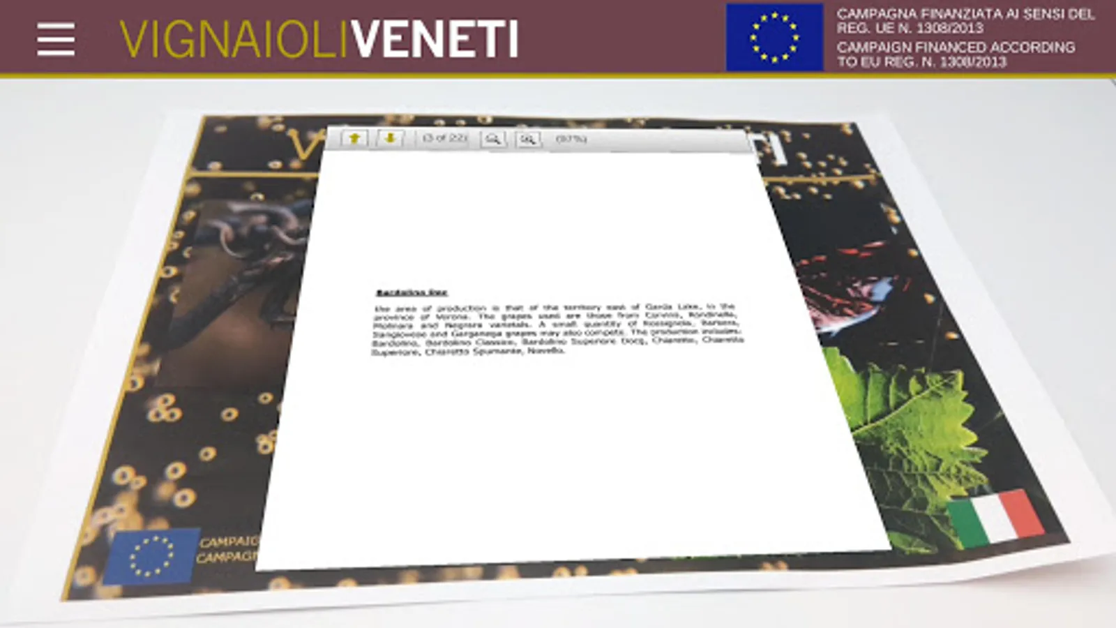 Società Cooperativa Vignaioli Veneti aims to enhance and support the wine tradition of the Veneto territory by stimulating and spreading an interest towards the quality wines of the Veneto territory. Its field of interest includes the provenance of the wines from the declared areas, their production with the specified grapes, use of appropriate proportions according to the traditional methods, the correct ageing processes for the different wines. Amongst its priorities, the Cooperative aims at a targeted and capillary promotion of P.D.O. and P.G.D.O. quality wines, taking them beyond European borders. The app is a part of a EU financed project by Reg EU n. 1308/2013 with the following target countries: South East Asia, USA."