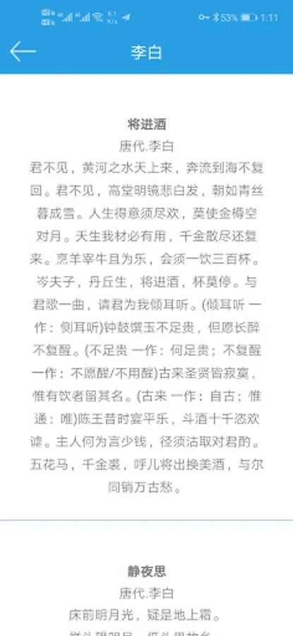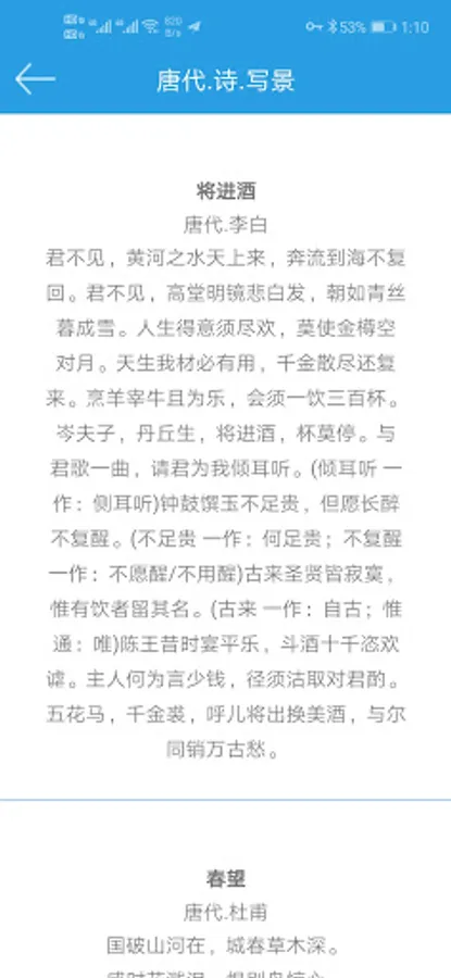 The APP contains a total of 3780 ancient poems in the Pre-Qin, Han, Wei, Jin, Southern and Northern Dynasties, Sui Dynasty, Tang Dynasty, Five Dynasties, Song Dynasty, Jin Dynasty, Yuan Dynasty, Ming Dynasty, and Qing Dynasty. Classic works such as Chu Ci, Quan Tang Poems, Quan Song Ci, etc. will help you learn the annotation, interpretation and appreciation of poems. It is like a spiritual Yangtze River and a Yellow River in the soul. It has a subtle influence on the people, cultivated sentiments, and nurtured generations of Chinese descendants.
