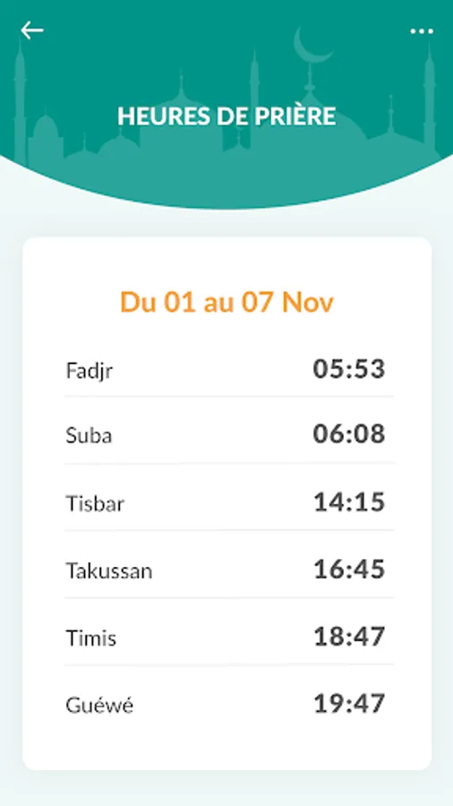With the DARADJI application, you can have the prayer times of Senegal each week.