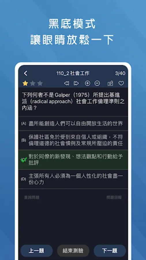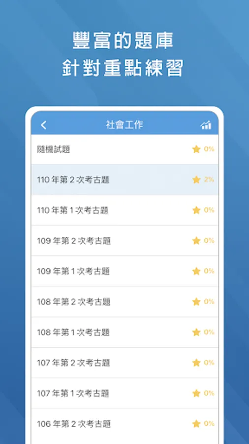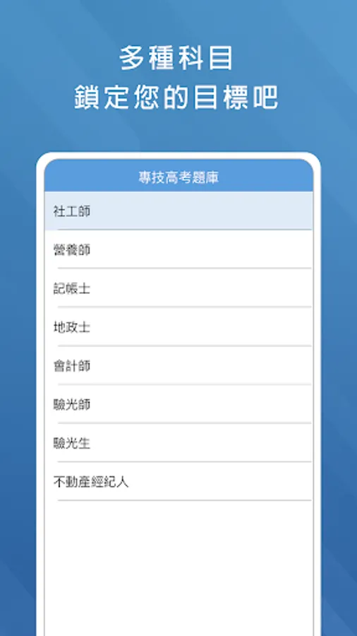 At present, it contains question banks for social workers (social workers), nutritionists, bookkeepers, landlords, real estate brokers, optometrists, optometry students, and accountants.