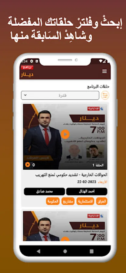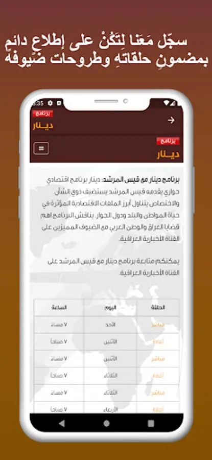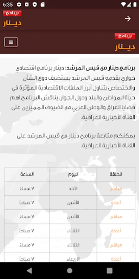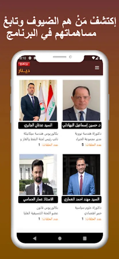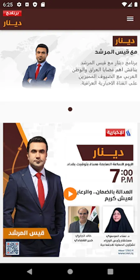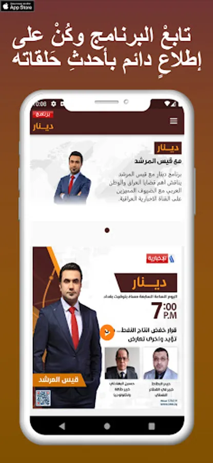 Dinar Program with Qais Al-Murshid: “Dinar” is an economic talk show presented by Qais Al-Murshid. The program discusses the most important issues of Iraq and the Arab world with distinguished guests on the Iraqi news channel.