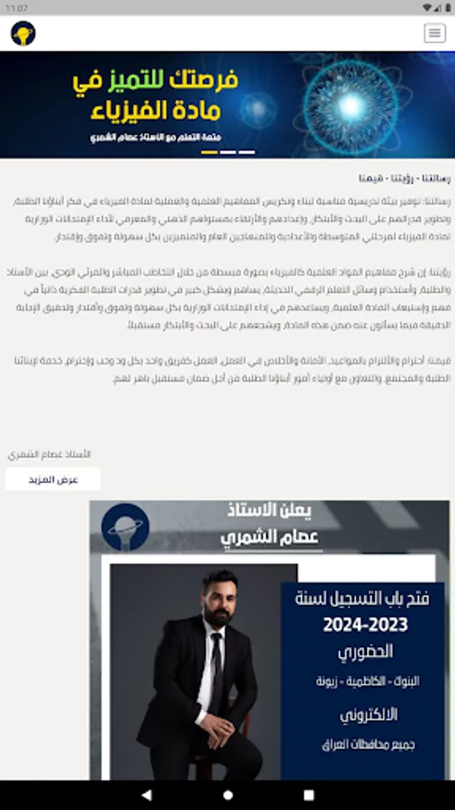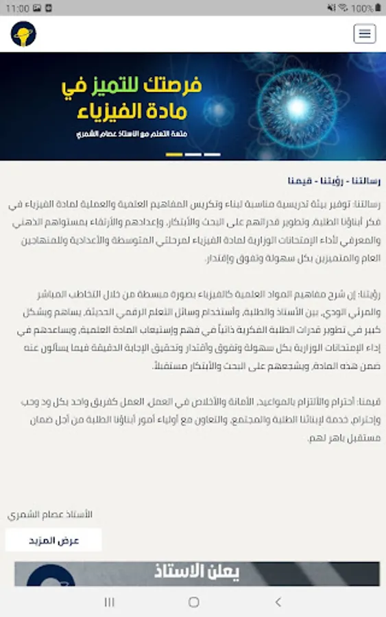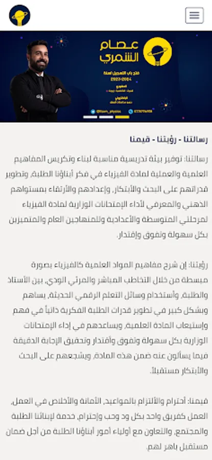 Providing an appropriate teaching environment to build and devote the scientific and practical concepts of physics in the thinking of our students, develop their abilities for research and innovation, and prepare them and raise their mental and cognitive level to perform the ministerial examinations of physics for the intermediate and preparatory stages and for the general and distinguished curricula with ease, excellence and competence.