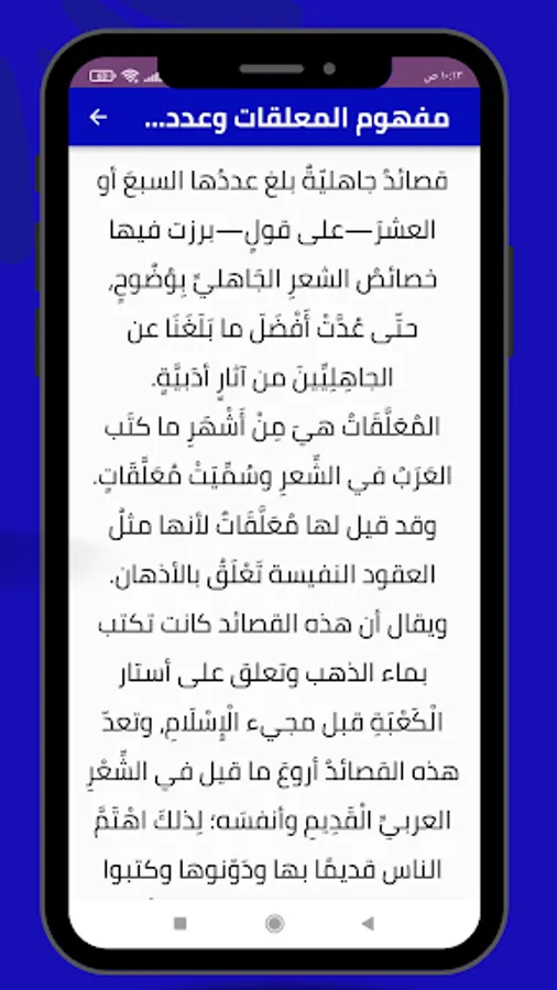 Al-Muallaqat are among the most famous of what the Arabs wrote in poetry, and they were called Muallaqat. It has been said that it is suspended because it is like precious contracts attached to the mind. It is said that these poems were written with gold water and hung on the curtains of the Kaaba before the advent of Islam, and these poems are the most wonderful of what was said in ancient Arab poetry and itself; That is why people in the past cared about it, wrote it down and wrote explanations for it, and it usually begins with mentioning the ruins and mentions the homes of the poet's beloved, and it was easy to memorize.