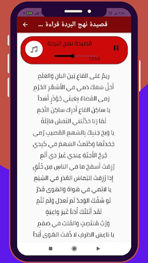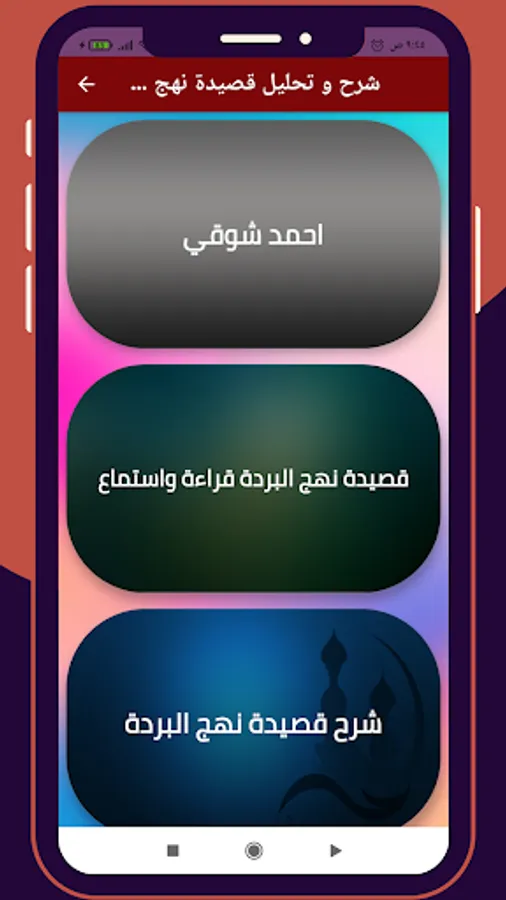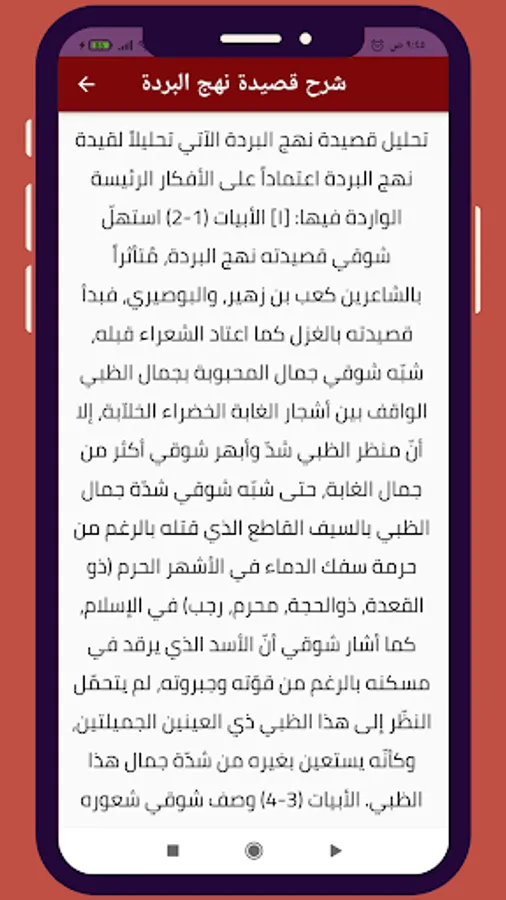 The application contains an explanation and analysis of the poem Nahj Al-Burdah by Ahmed Shawqi in praise of the Holy Prophet