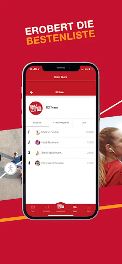 In your company you select a team captain who books and manages your starting places at www.firmencup.de for your BASF FIRMENCUP VIRTUAL on the website, creates the team in the app and provides his participants with team codes. As a participant, you can also download this app onto your smartphone. When registering, enter your team code as the last step. You will be automatically assigned to your team and you can start collecting points!