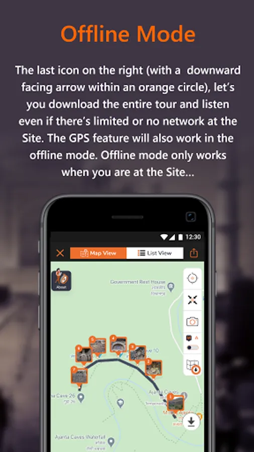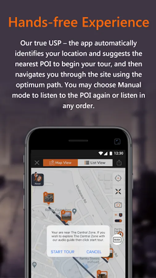 • The Manual-mode helps you access all of the App’s features even if you are not in the vicinity of the site (e.g. home or hotel). However, to play the audio for a POI, you need to press the POI location pin or the Play button on your app-screen, manually.