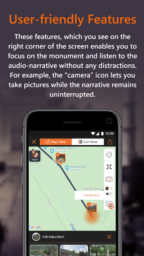 • The App has an interactive menu with features such as an integrated camera function (lets you take pics while listening to the tour), auto location (helps you to locate yourself within the site), and list-view (chronological order of POI’s within the site).