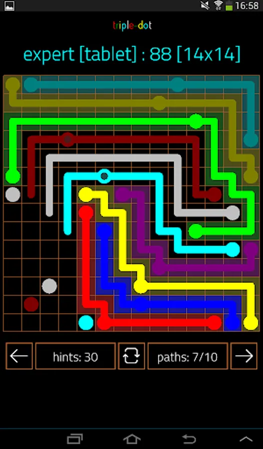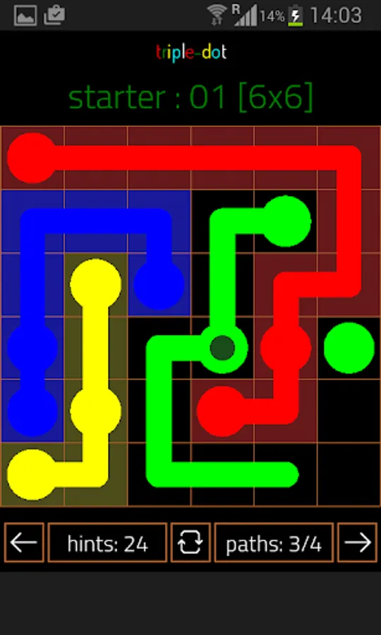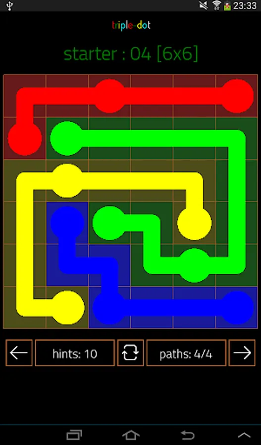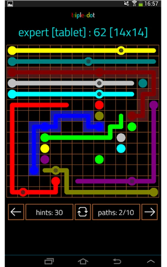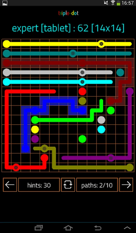 Triple-Dot has three of the same color. The third dot initially provides a helping hand, but soon it becomes the trouble maker. Here you not only have to take d-tours to avoid collisions of paths but also think about the order of connecting dots.
