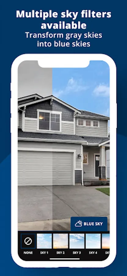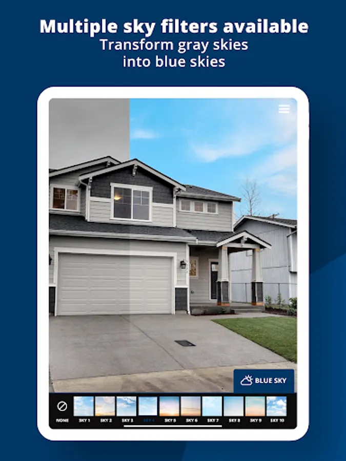 Shoot the outdoor of a property and use the Blue Sky feature that allows you to replace a gray sky with a beautiful blue sky. This process is done in a second, and gives you stunning results.