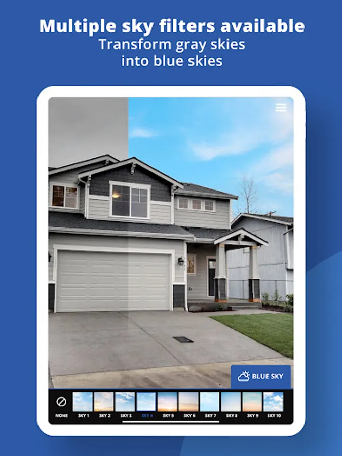 Shoot the outdoor of a property and use the Blue Sky feature that allows you to replace a gray sky with a beautiful blue sky. This process is done in a second, and gives you stunning results.