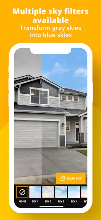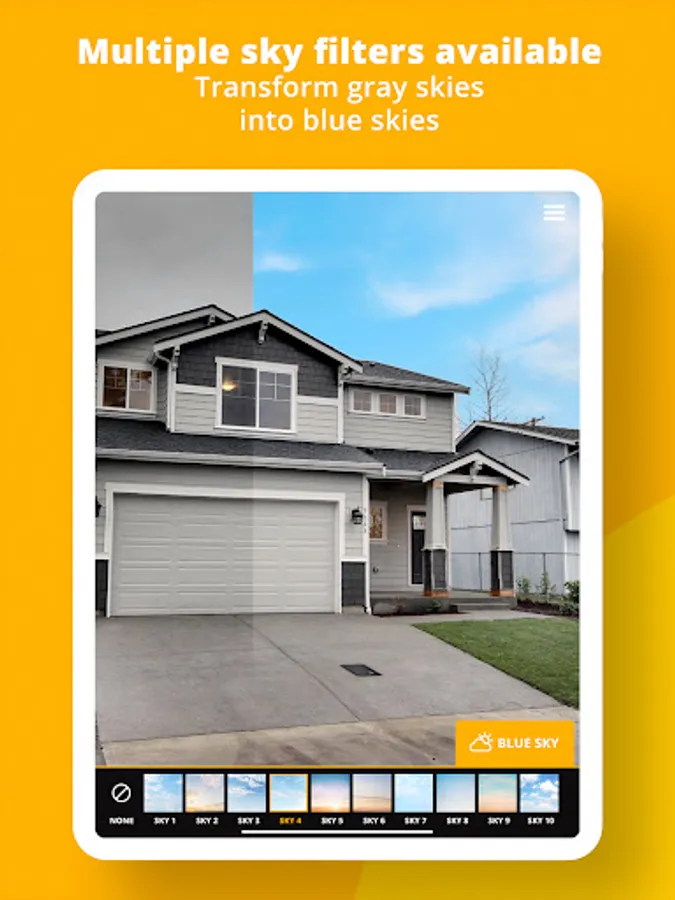 Shoot the outdoor of a property and use the Blue Sky feature that allows you to replace a gray sky with a beautiful blue sky. This process is done in a second, and gives you stunning results.