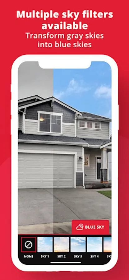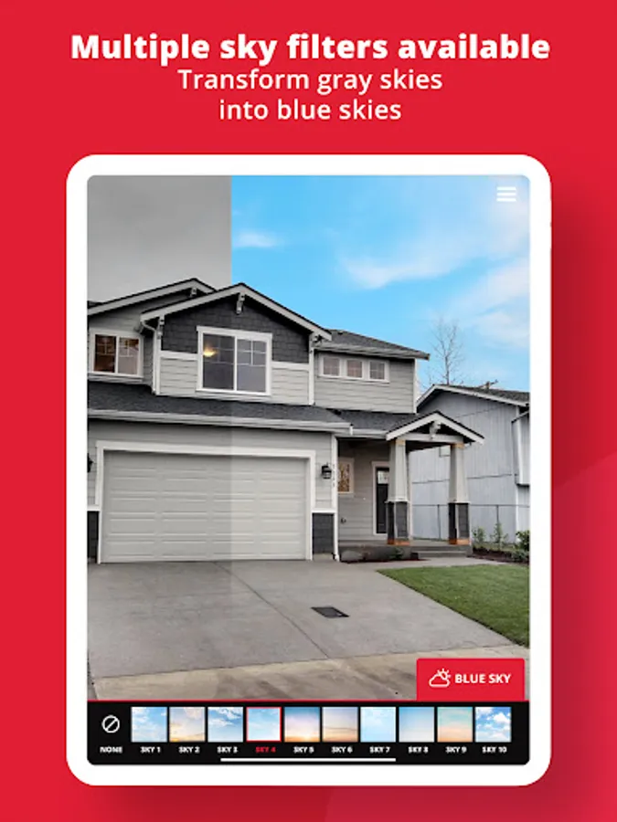 Shoot the outdoor of a property and use the Blue Sky feature that allows you to replace a gray sky with a beautiful blue sky. This process is done in a second, and gives you stunning results.