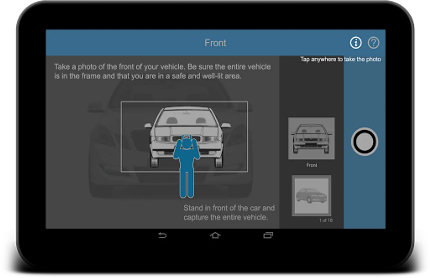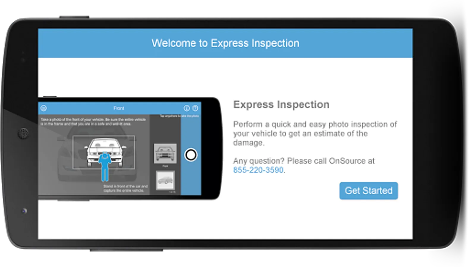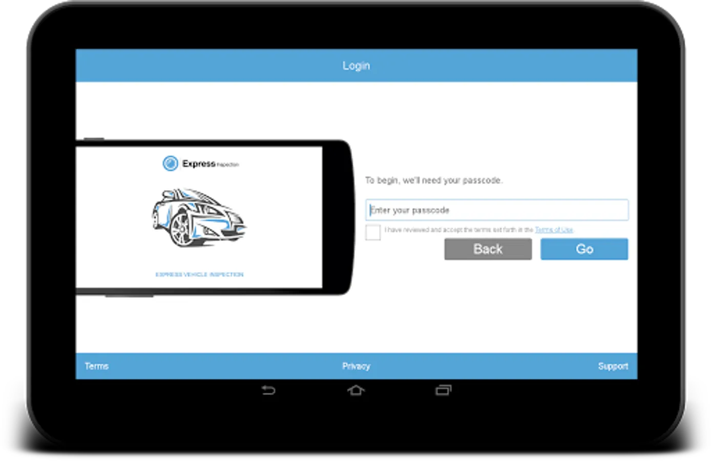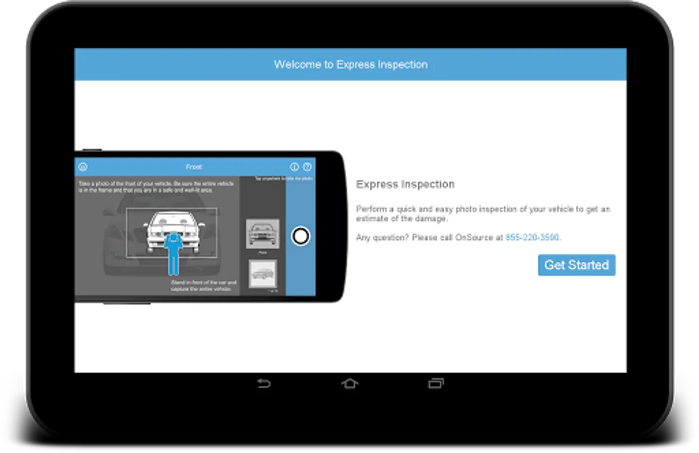 The Express Vehicle Inspection App allows users to submit vehicle photos and video to their insurance company. Users of the app must have a valid passcode from a participating insurance company to use the app.