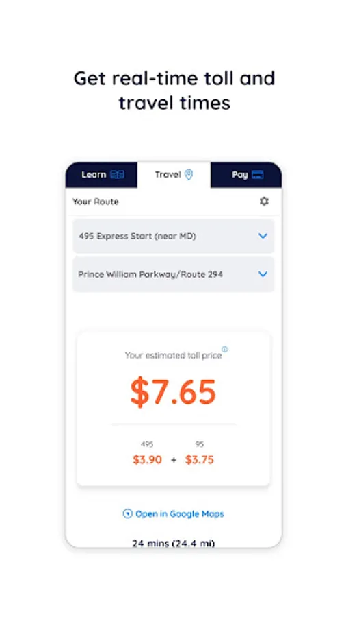 Safety first. Please don’t use this app while driving. Toll price and trip duration is subject to change at any time based on traffic conditions. Remember to check out current toll prices displayed on signs just before you enter the Express Lanes. And don’t forget! You need an E-ZPass® or E-ZPass® Flex to use the Lanes.