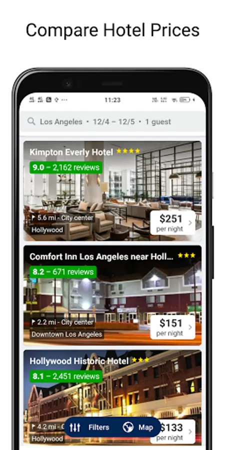 Don't worry if you're visiting a place for the first time. Use the "Hotels Near Me" option in our cheap extended stay hotel booking app. It will help in finding the cheap hotels in your location. Compare prices of each hotel with multiple travel agencies and select the one that suits you. Also, find weekly motels, cheap hotels tonight stay, last minute hotel, long-term stay rooms, etc., with us.