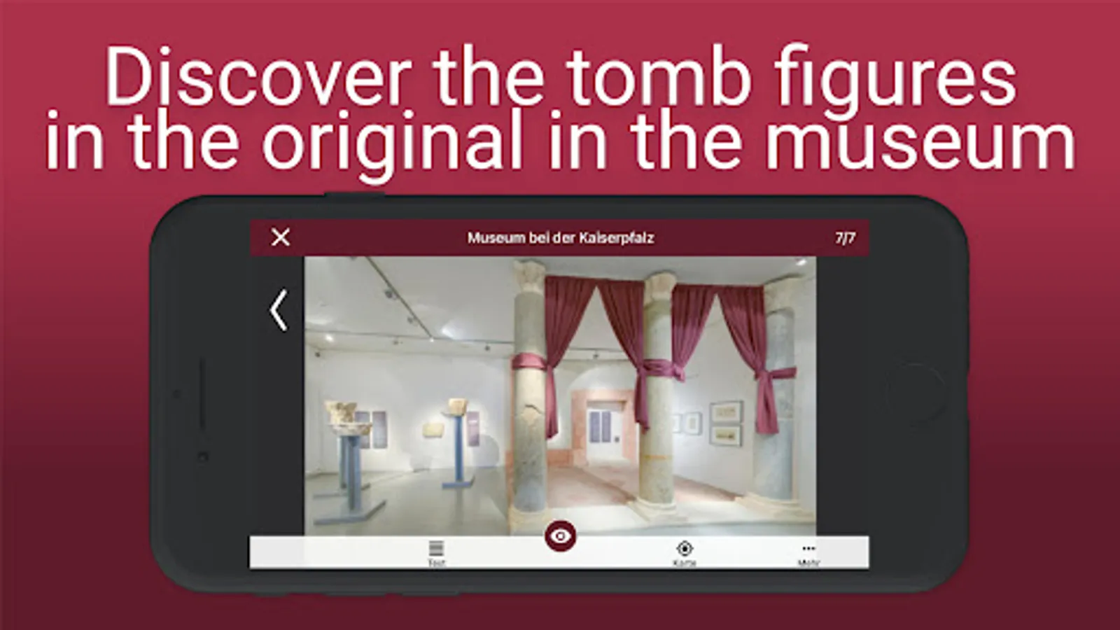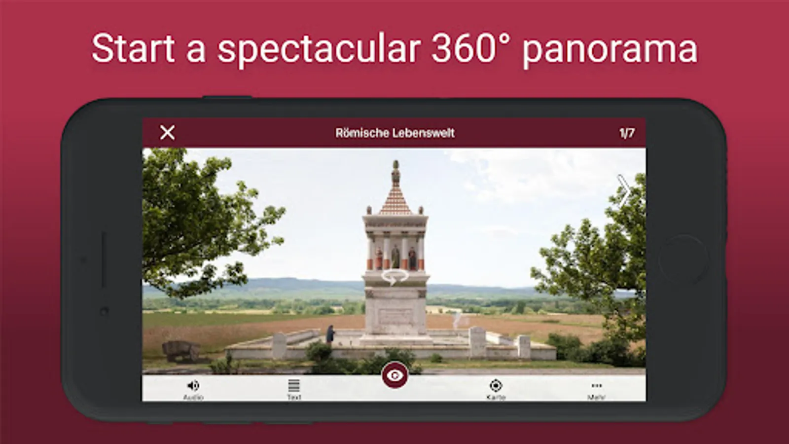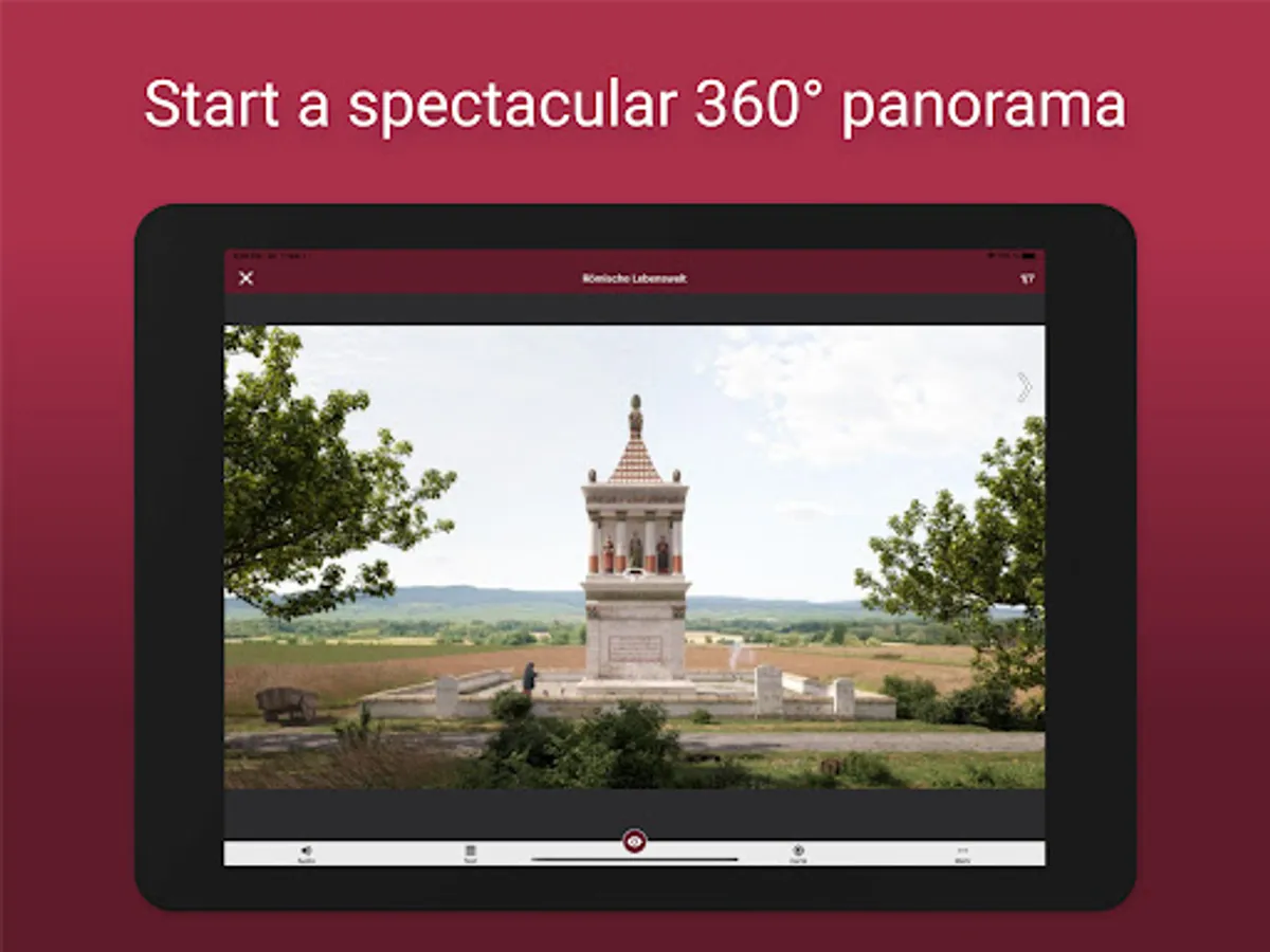 The app "Ingelheim in Roman times" links objects from the "Museum bei der Kaiserpfalz" with their discovery sites. Through 360° panoramas in augmented reality, videos and images, the Roman environment of the 1st century AD in Ingelheim is brought to life.