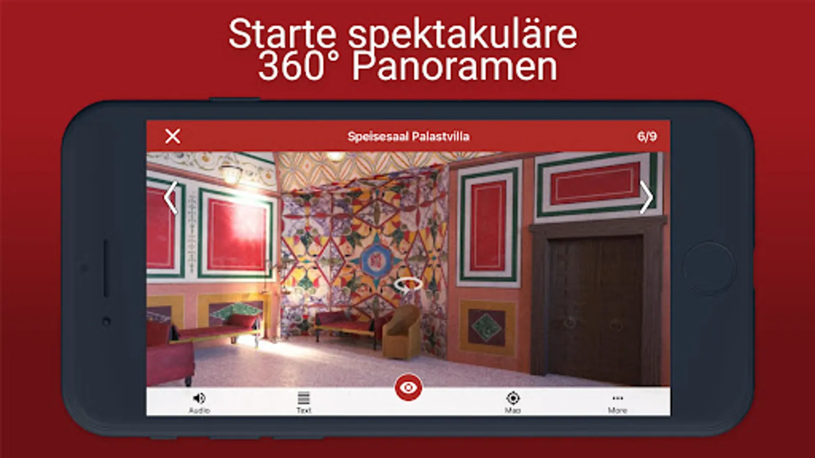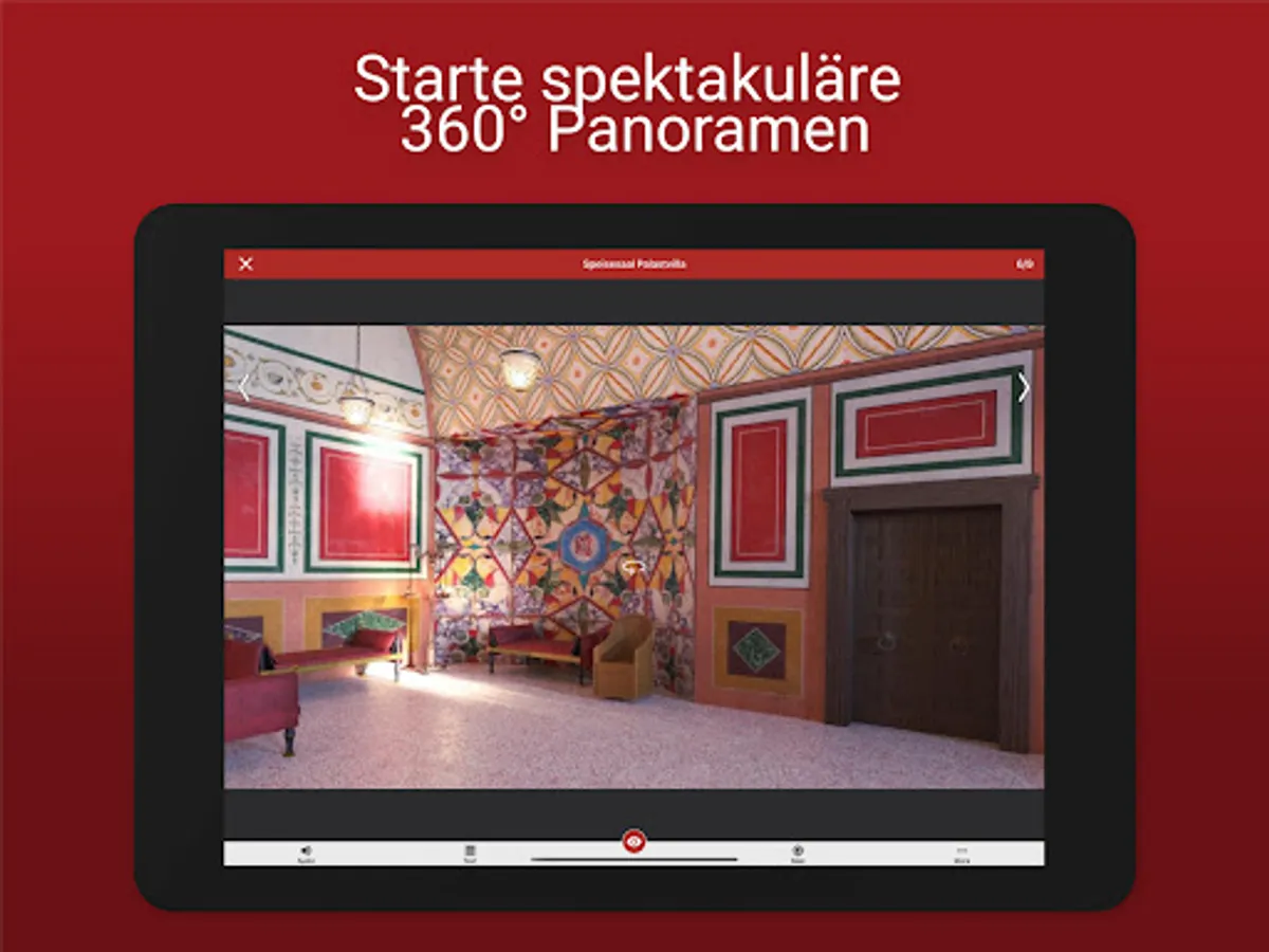Arriving at the selected location, the virtual experience starts with the call-up of the reconstructed interior and exterior views of the palace villa as a 360-degree panorama image. The app recognizes your viewing angle based on the compass data of the smartphone or tablet you are using and when you open the 360 degree panorama, it shows you the exact section of the panorama that matches the viewing angle. Changes in the viewing angle, rotating, tilting and tilting movements change the displayed image section in real time.