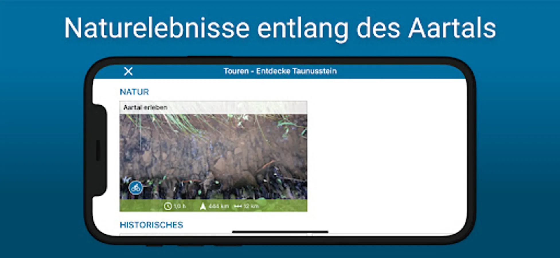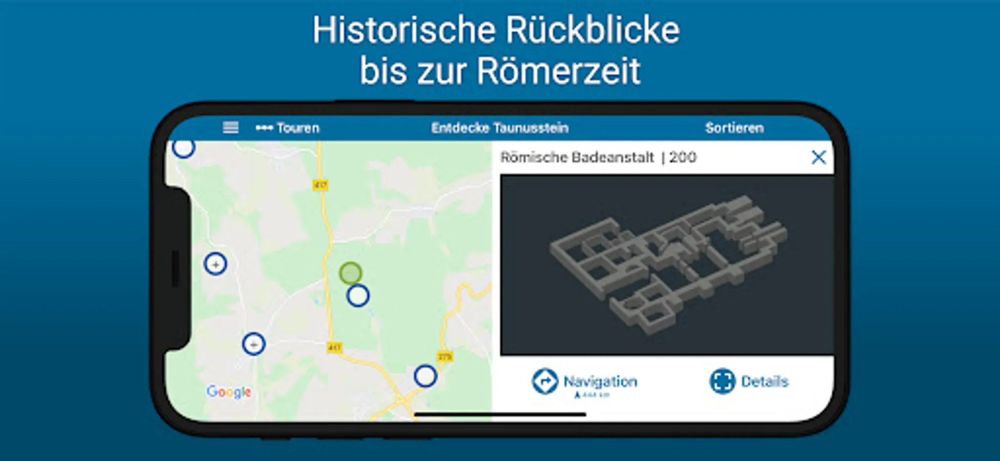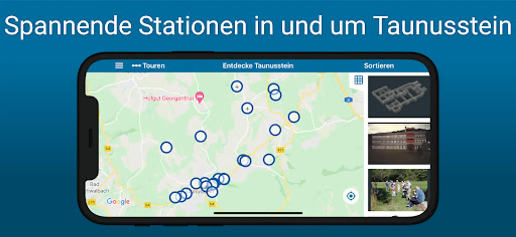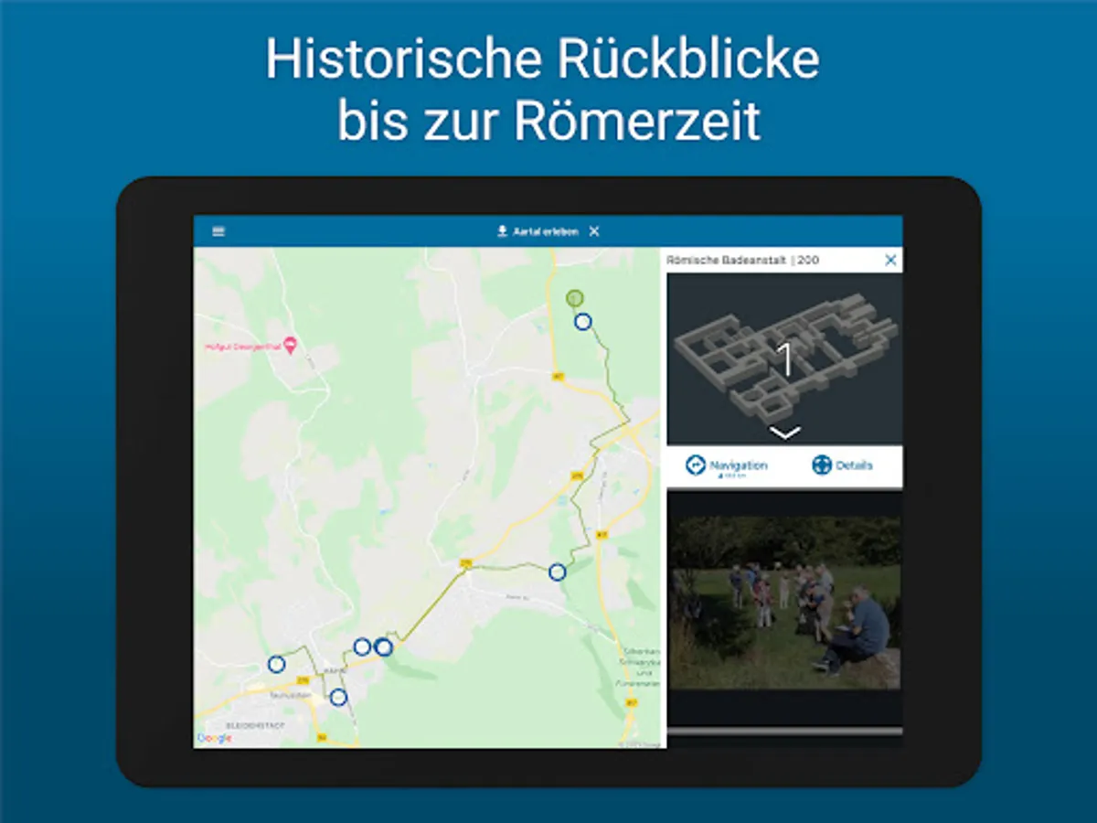 The app offers free interactive and multimedia tours on various topics and focuses in and around Taunusstein, including navigation.
