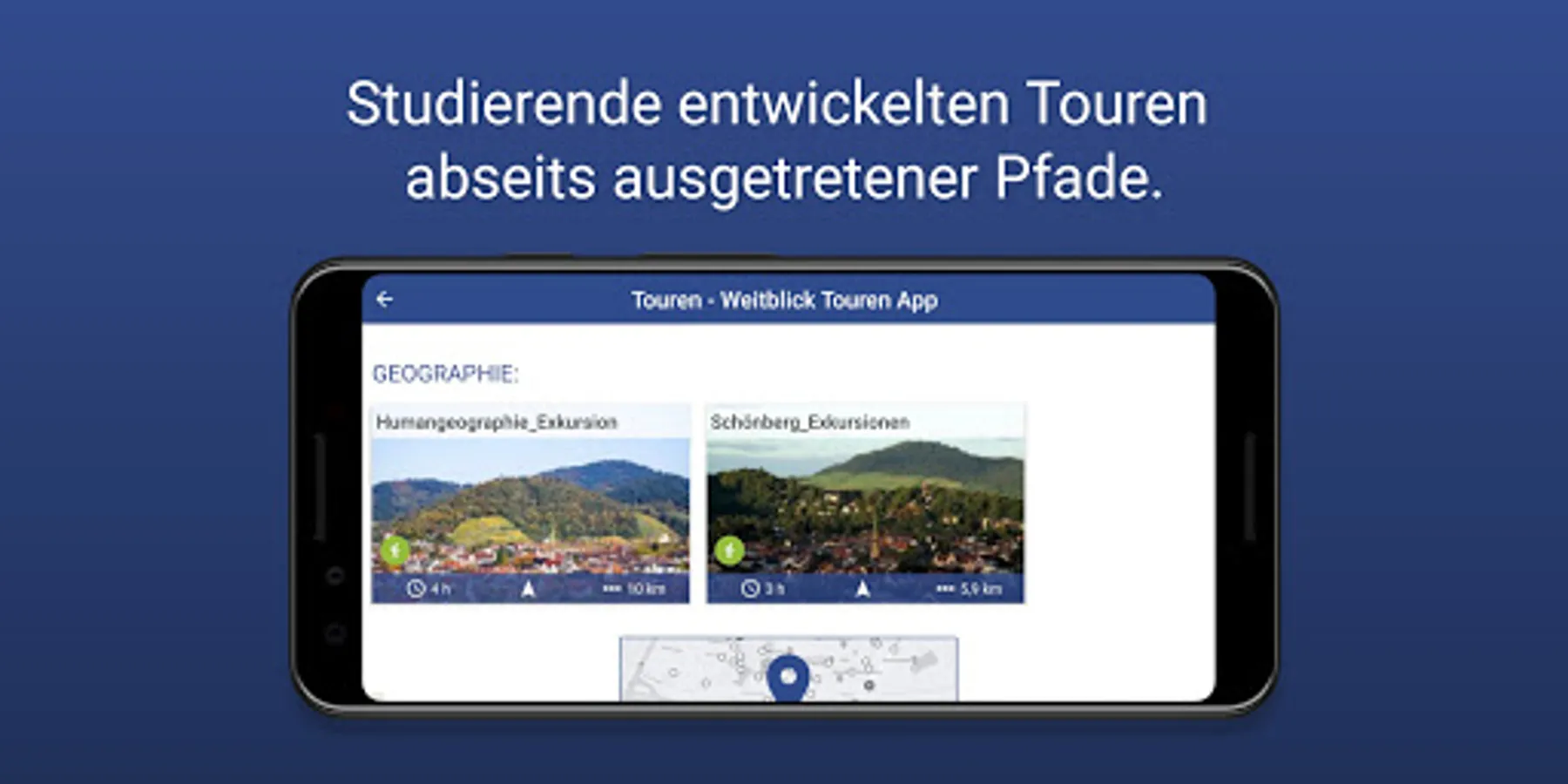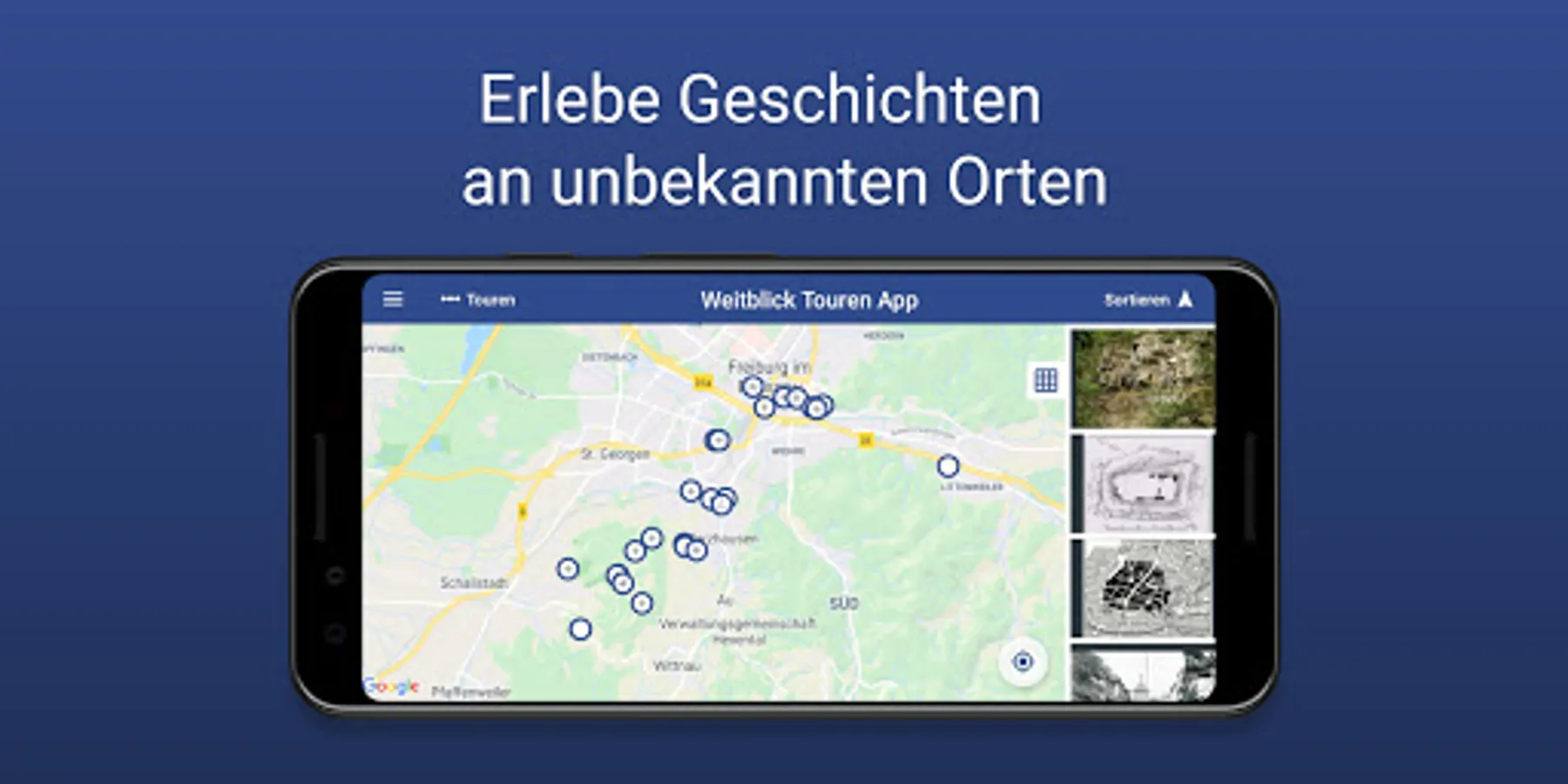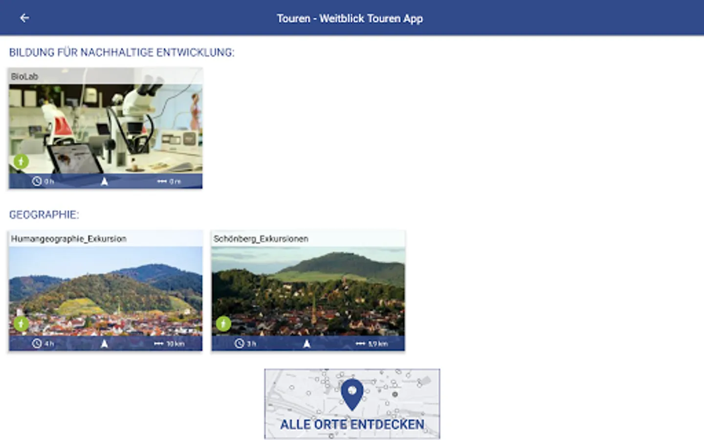 When you open the app for the first time, you will see an overview of all the themes and tours included in the Weitblick app. Find the theme and tour of your choice or scroll down and select Discover All Places.