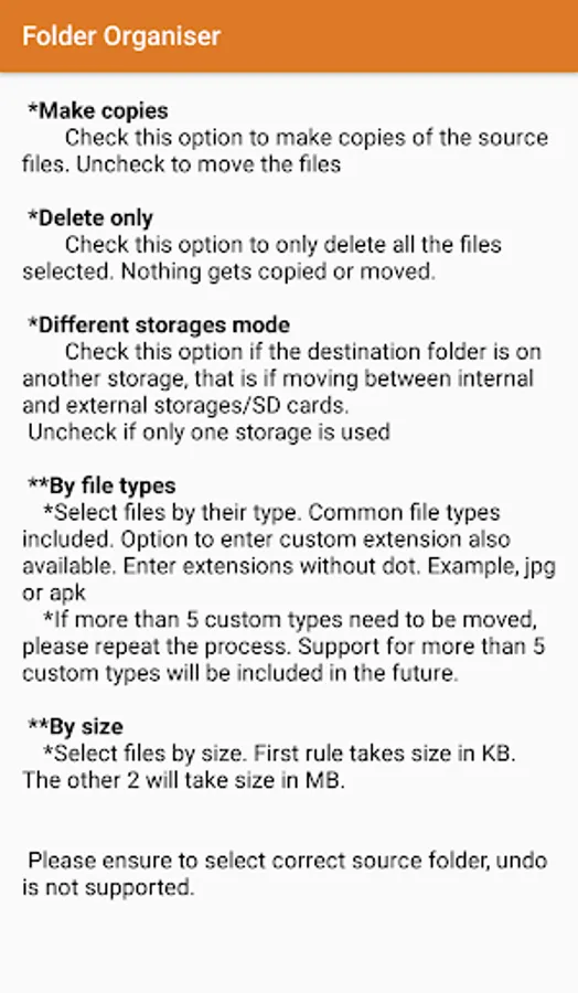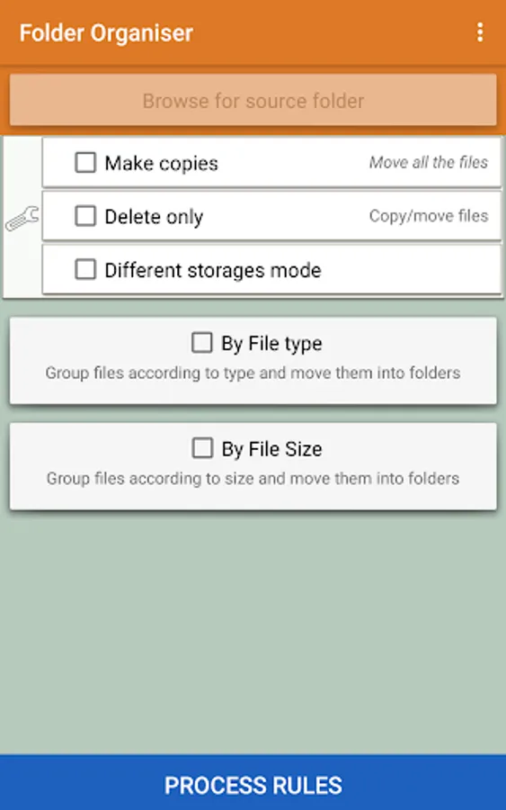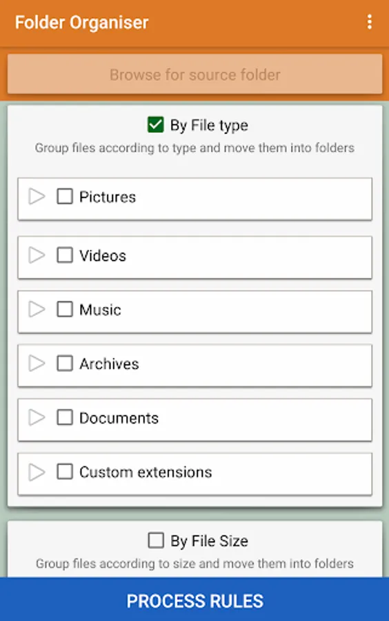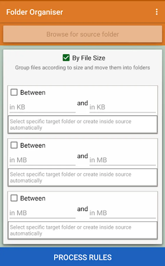 Select a source folder and select rules. Sub-folders will be automatically created inside the source folder. Separate destination folders can also be chosen for each separate rule.