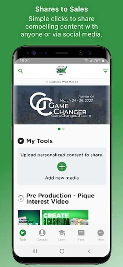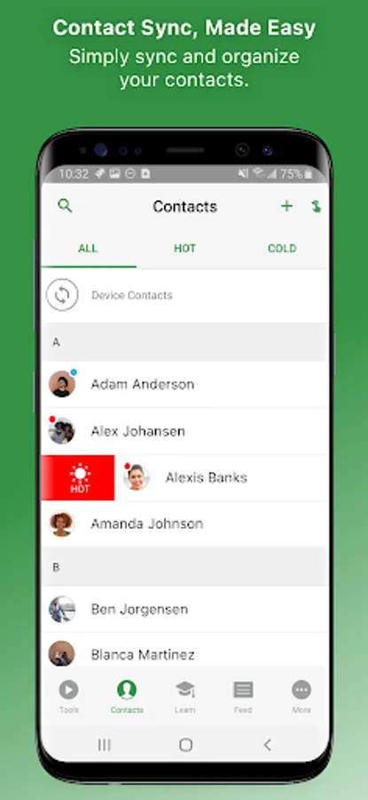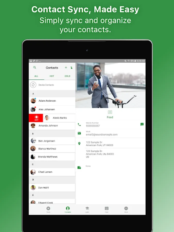 Contacts: Choose how to sync and manage your contacts. Swipe to sort them by interest level. You can make connections, add notes, or check out the Contact Feed to see the tools you’ve shared and contact actions.