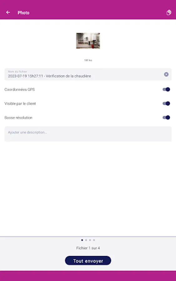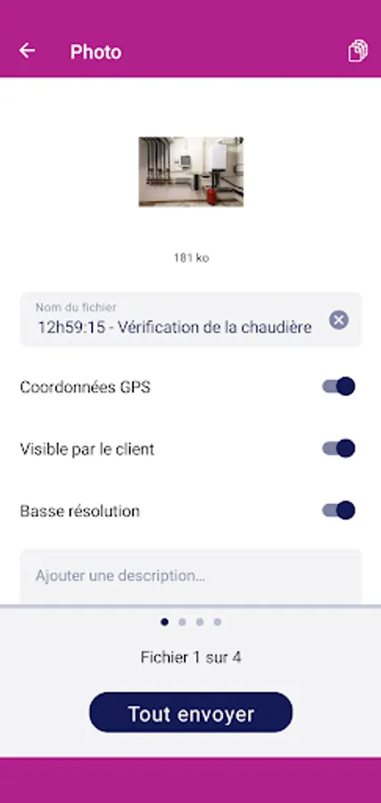 Send your photos directly to the client's briefcase, even offline. You can modify them and include the GPS coordinates of your position. You can choose to send them in low resolution for more speed and to save space.