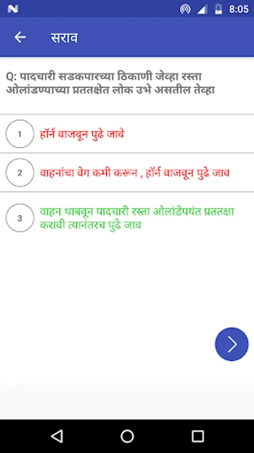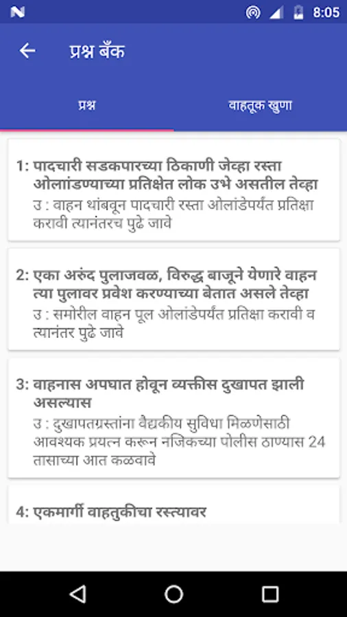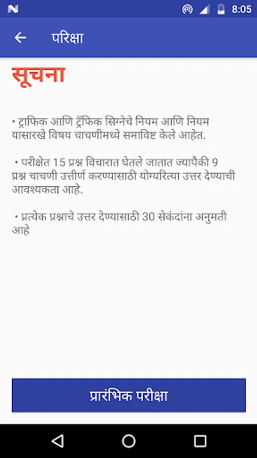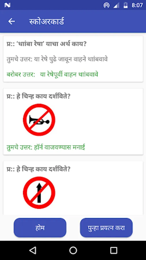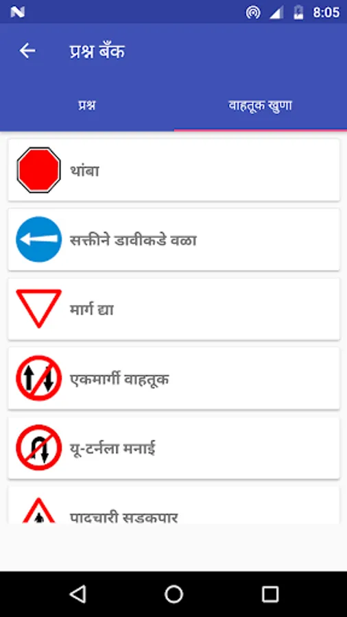 - Exam : Exactly same as RTO test, random questions and road signs related questions will be asked in this exam.Time limit for each question will be 48 seconds(Exam Mode)