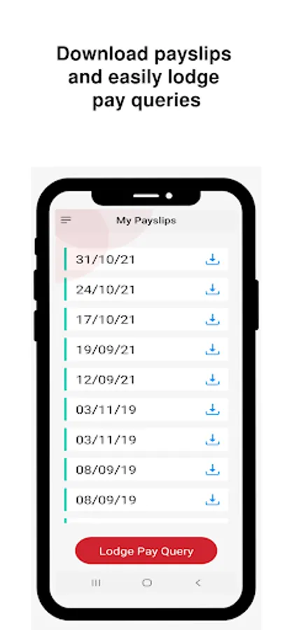 - Download their Payslips (also function to lodge a pay query and message sent directly to payroll department)