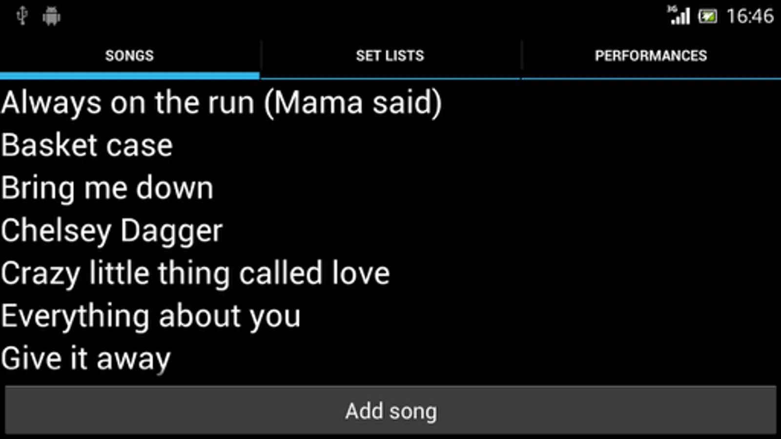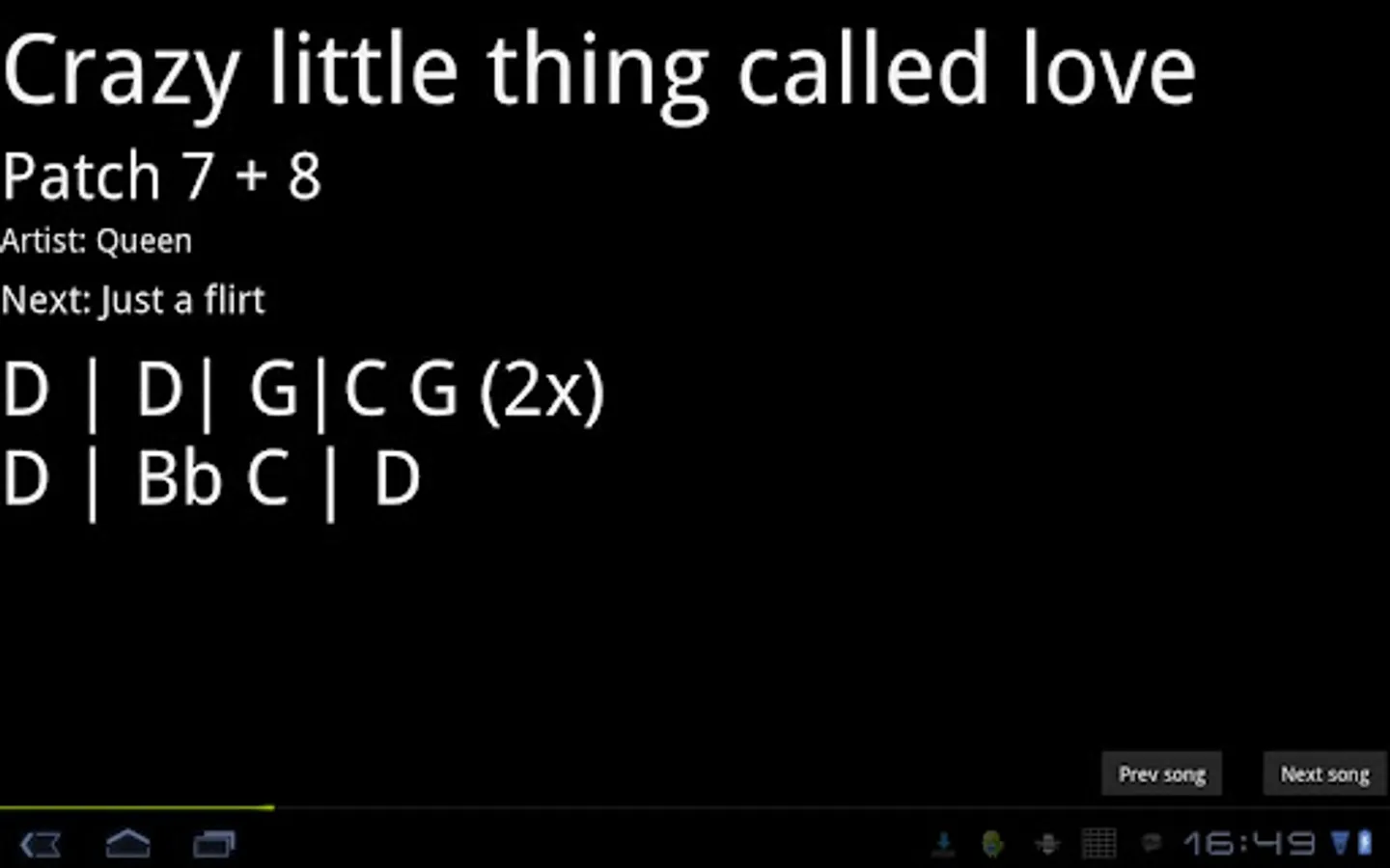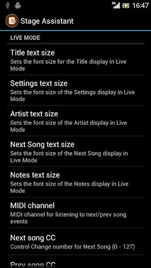 Stage Assistant is an app for Android that allows you to set up a database with your songs and organize them into set lists and performances. On stage, the app will display the information you entered for each song, like preset numbers, chord schemes or song texts. If you connect a USB MIDI interface and MIDI controller to your Android device, you can switch between songs using MIDI control changes.