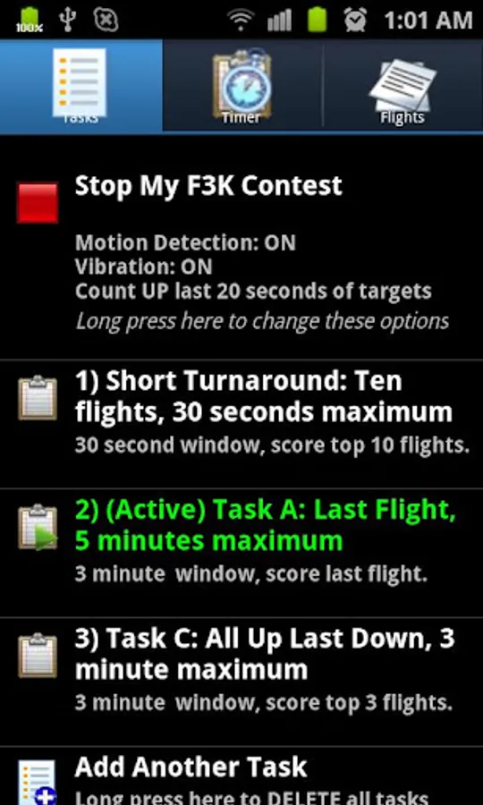 Select from the available official F3K tasks, special practice tasks, or configure your own. The timer displays and calls out your flight, window and target times as they change throughout the task. Target time is adjusted where necessary as you progress through the task.
