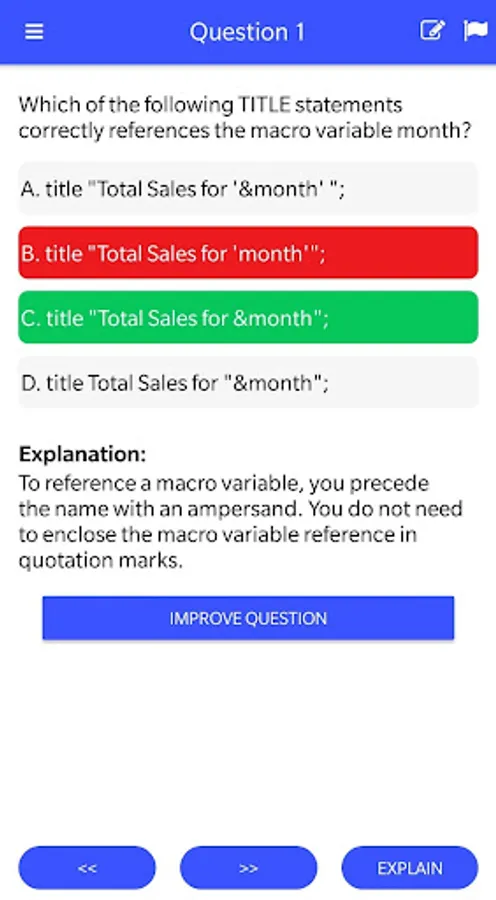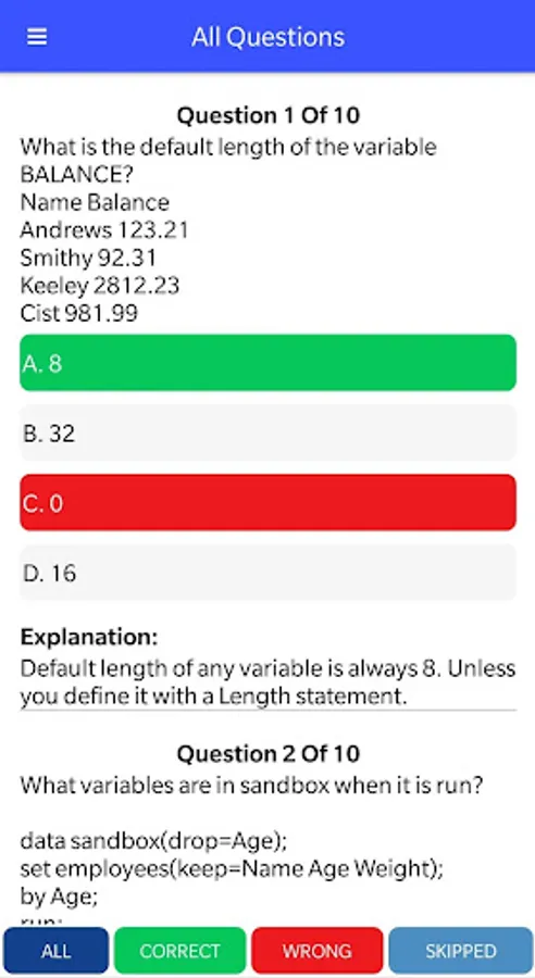 Advance Sas Quiz is free application which aims to help SAS Programmer to crack Advance Sas Certification. It provides various exam modes and takes care about user preferences. It comes with Practice mode where user practice unlimited questions and can see correct answers for the question on the spot along with explanation. This app also has Quick Exam, Main Exam, Timer Exam Mode. You can see the how you are doing in progress section.