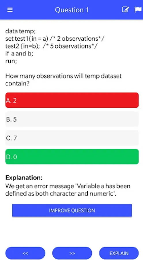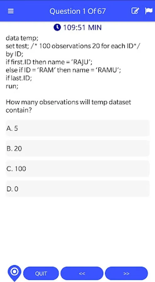 Base Sas Quiz is an application which aims to help SAS Programmer to crack Base SAS Certification. This app has more than 430 unique questions which come with various exam modes and takes care about user preferences. It comes with Practice mode where user practice unlimited questions and can see correct answers for the question on the spot. This app also has Quick Exam, Main Exam, Timer Exam Mode. You can see the how you are doing in progress section. You can see what questions you answered incorrectly and you can also flag questions which you find tricky or want to visit them again.