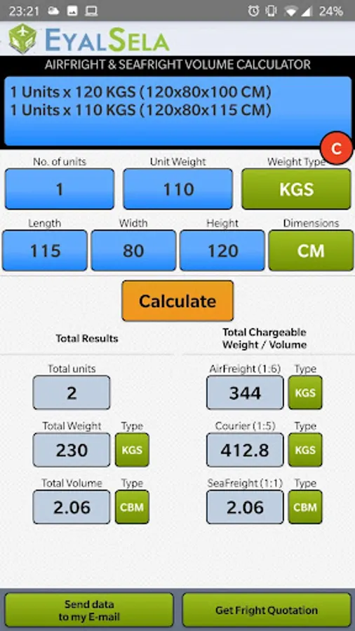 The calculator application is for calculating the Volume and weight for international delivery charge in airfreight and sea freight shipments.