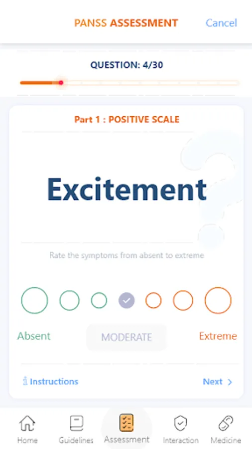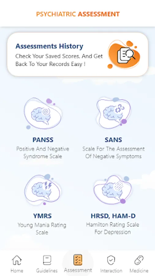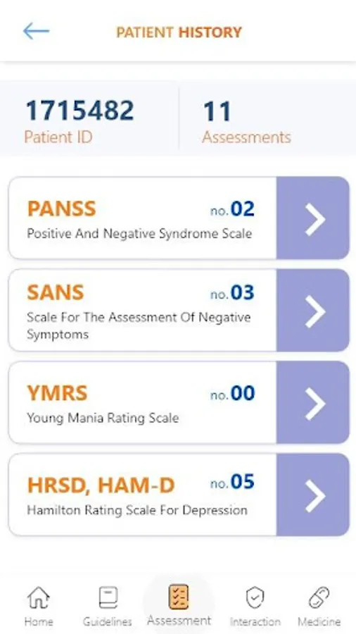 • Start one of four assessments of the most common psychiatric disorders to help identify the severity of the case.