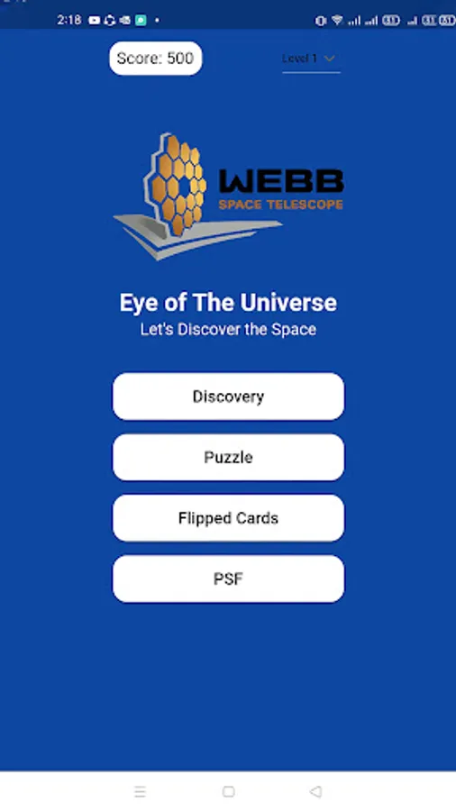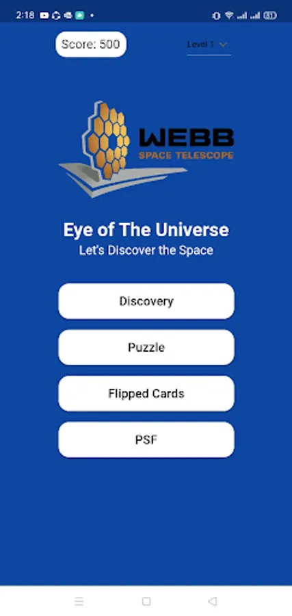 Our game is divided into 4 stations: Discovery, Puzzle Game, Memory Game and PSF, and 5 levels, each level has a new image captured by James Web Telescope to be opened to the player to play with it in the stations.