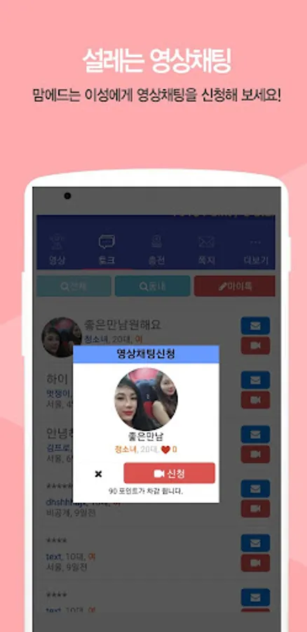 - 원하는 이성에게 영상요청 을 시도하여 상대방 수락후 영상통화